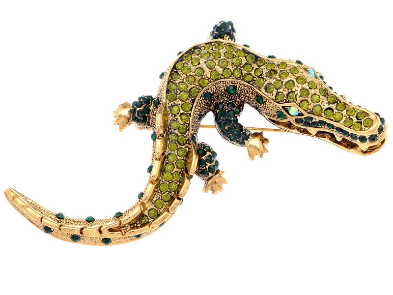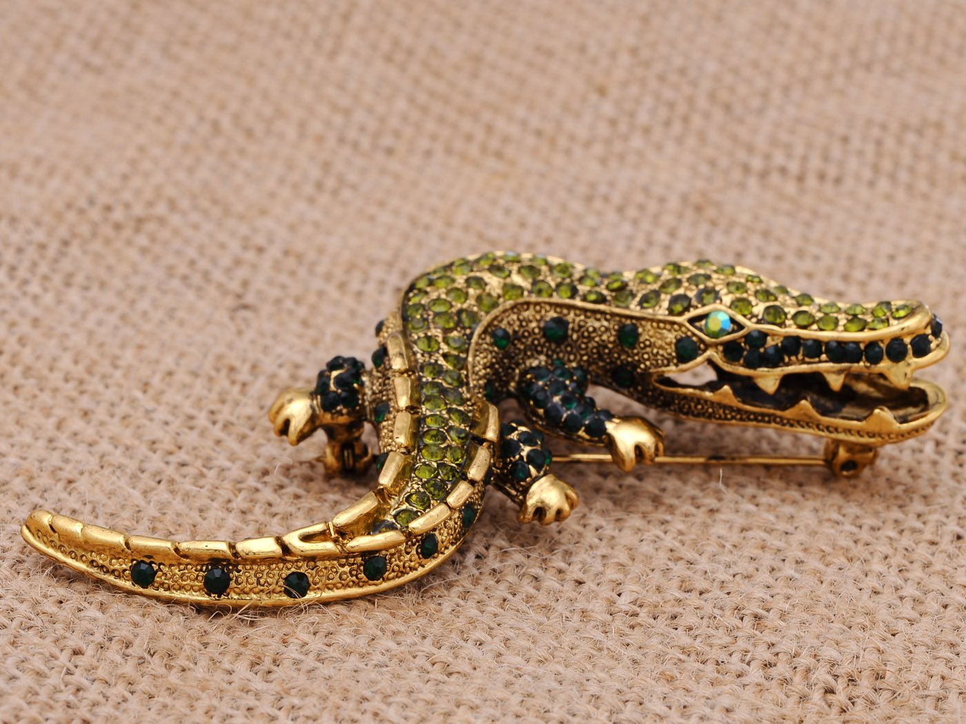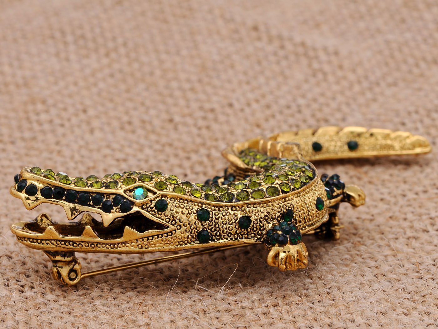 - UNIQUE DESIGN - Brooch featuring crocodile design with mostly green colored rhinestones.