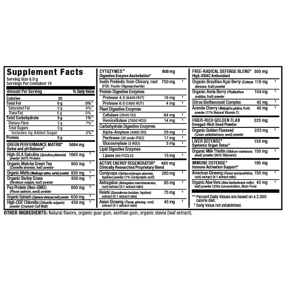 - Loaded with Double the Green Ingredients: Cytogreens is an Ultra-Concentrated Green Superfood powder with double the amount of green ingredients as leading greens supplements. Loaded with Chlorophyll-Rich Green Superfoods like Spirulina, Cracked-Cell Chlorella and Ultra-Fine Premium Japanese Matcha Green Tea.