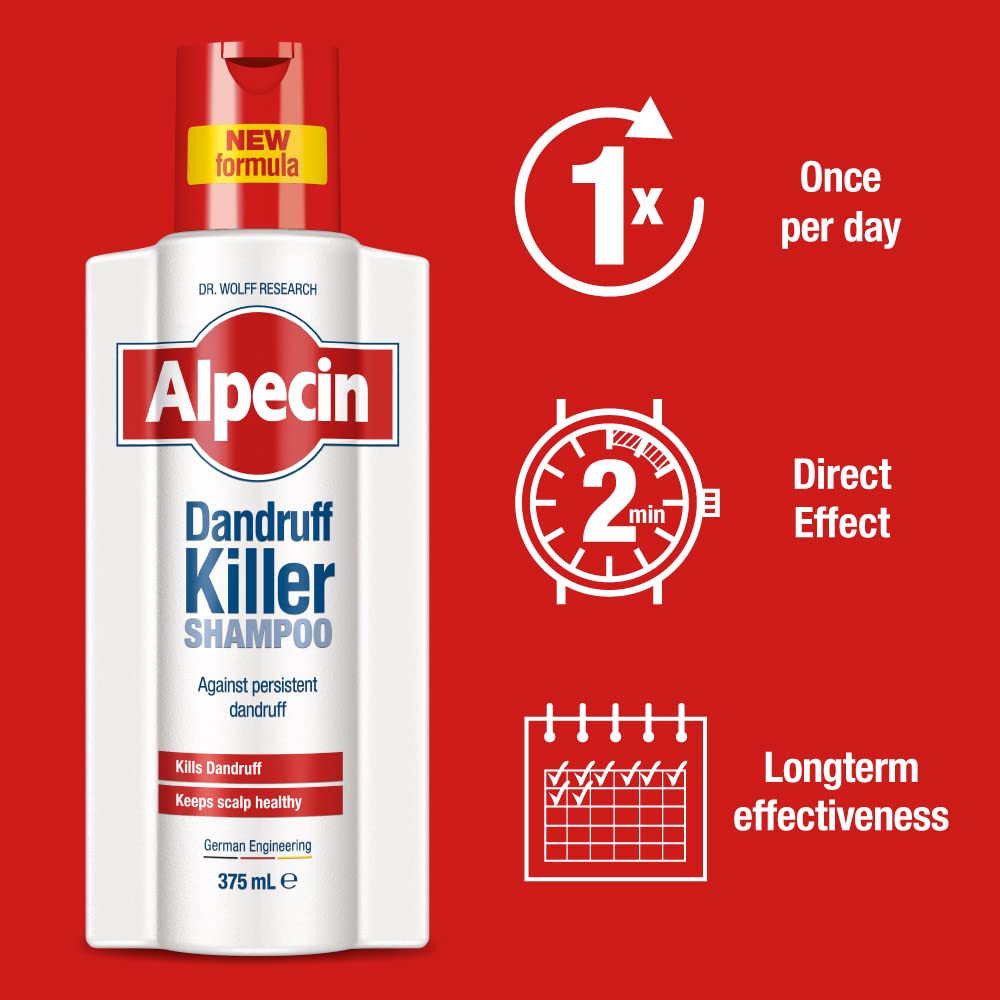 - YOUR DAILY HAIR ROUTINE Use Alpecin Dandruff Killer every day. Distribute a walnut-sized amount evenly through wet hair and massage in. Rinse immediately afterwards. Alpecin Dandruff Killer comes without any softening silicones.