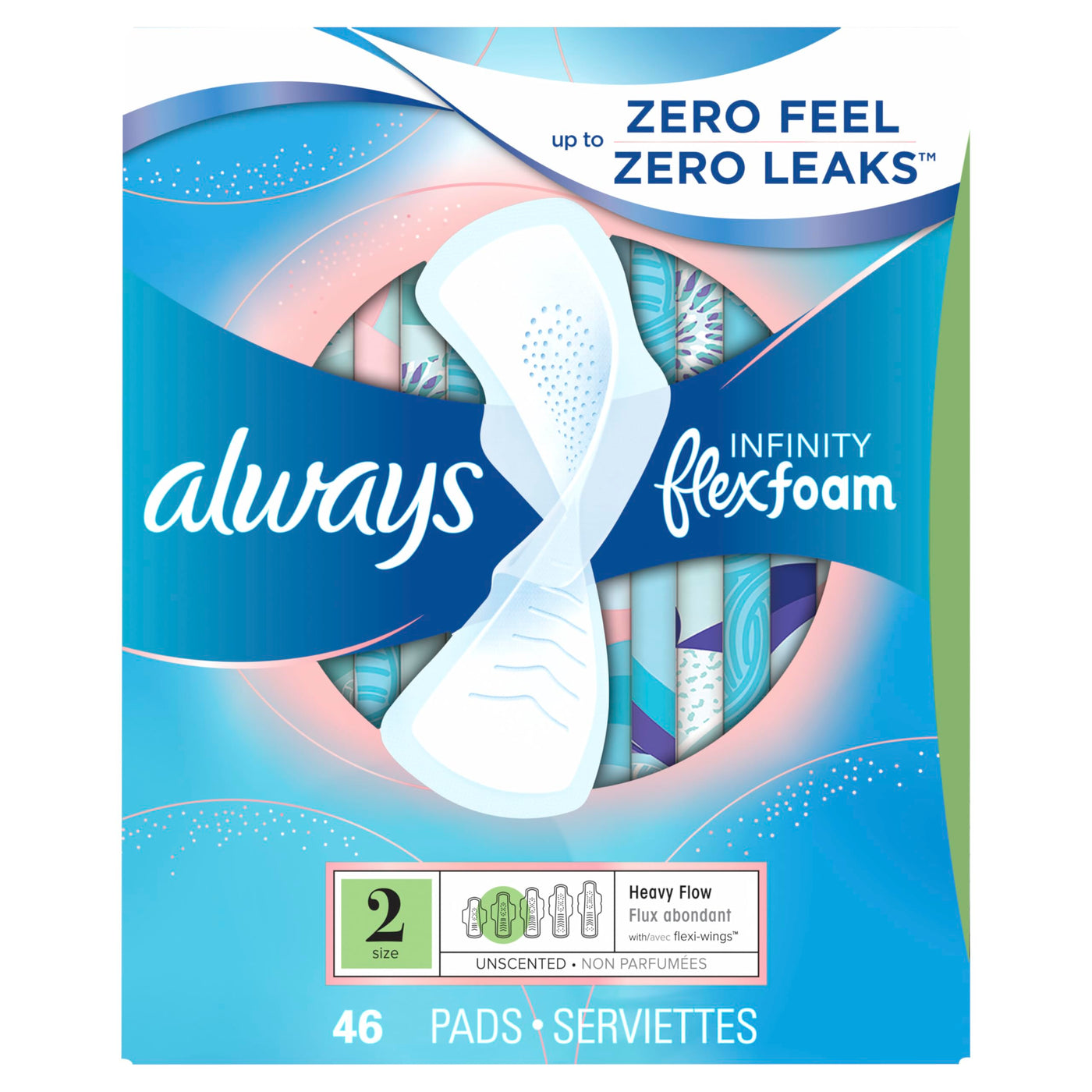 Try Always Infinity FlexFoam for a pad that feels like nothing and protects like nothing else! With Always Infinity FlexFoam pads a Zero Leak and Zero Feel period is possible. FlexFoam pads absorb up to 10x their weight. FlexFoam pads are unbelievably thin and flexible, so your pad moves with you, not against you. Zero Feel protection is possible with our driest, breathable top layer, and super absorbent holes that pull wetness away from your skin. Always FlexFoam pads are dermatologically tested, and approved as skin friendly by the Skin Health Alliance. Always Infinity pads are made with FlexFoam, Not Fluff. With Always Infinity FlexFoam, the holes and slots in the core pull fluid away from your body and distribute it to the bottom of the pad. So, it absorbs more and leaves you feeling drier, for protection that doesn’t hold you back.Always Infinity FlexFoam pads offer up to 10 hours of protection, so in between balancing the day's to-do list, you don't have time to question your period protection. In addition, they also have a breathable top layer that keeps you feeling dry all day long, so you can say goodbye to hot and stuffy. Available in 5 Sizes: FlexFoam is designed for anybody and every body. Use the Always MyFit Sizing Chart to find your perfect fit.