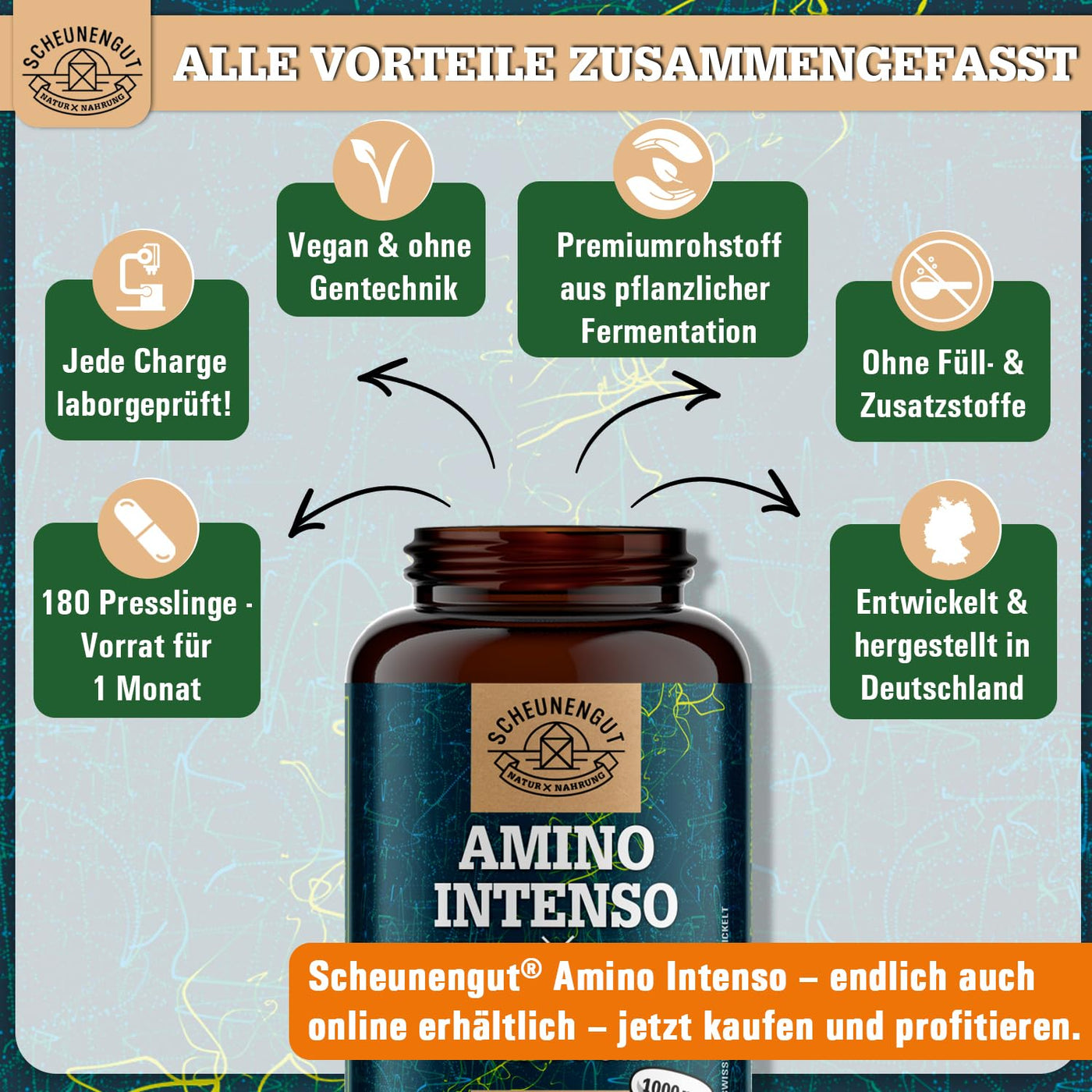 - OPTIMIZED BIOAVAILABILITY - Amino Intenso is not just an amino acid complex. All components are coordinated with one another in an ideal ratio and reinforce each other's effect. One pellet provides just as much essential amino acids as 7g of protein. 100% vegan and in its purest form - a quality promise from us to you!