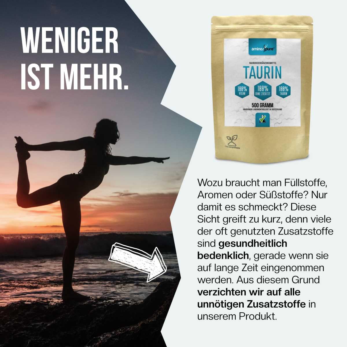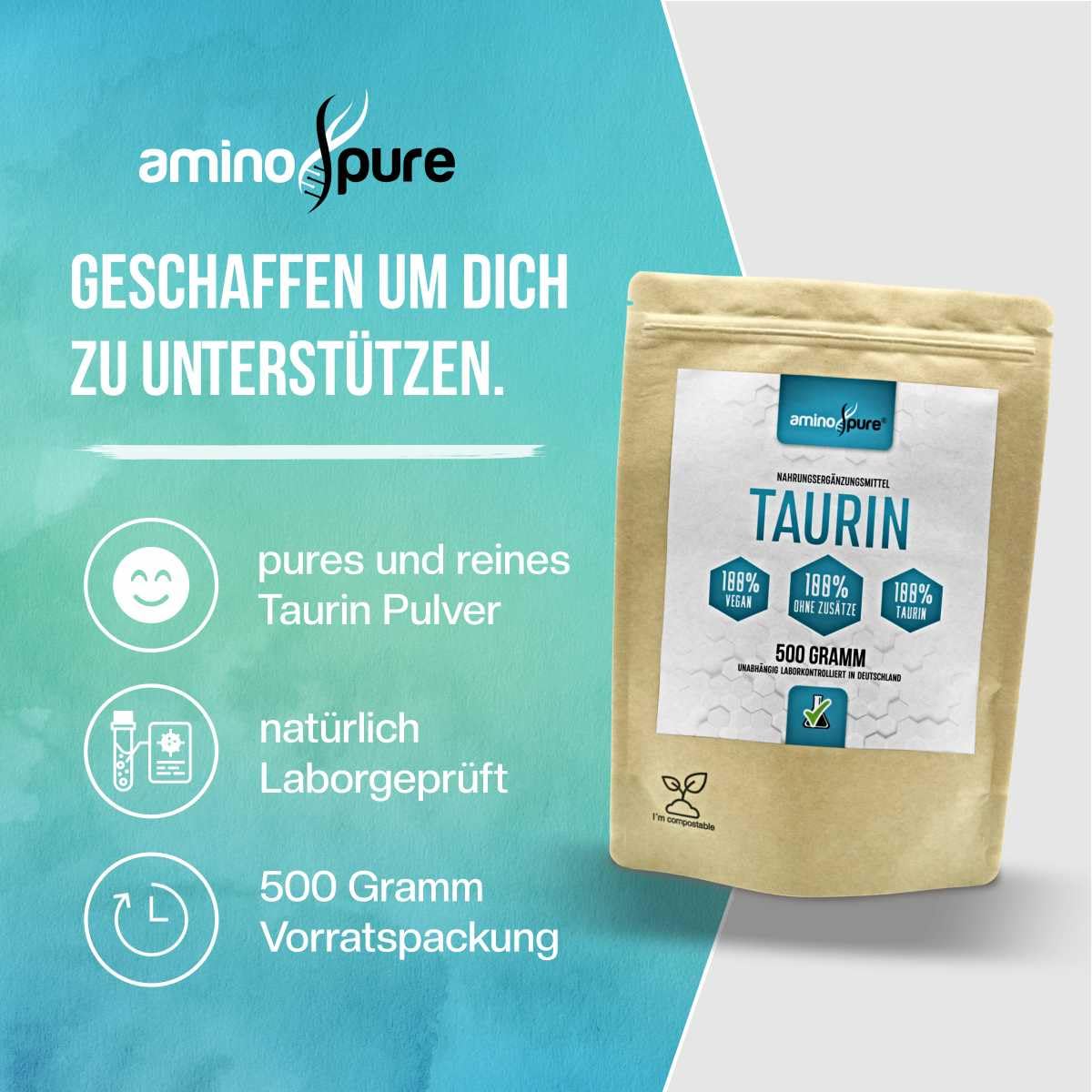 aminopure® | Taurine powder pure | pure and vegan taurine without additives | 500 servings (1 gram per day) | tested for harmful substances in the laboratory with certificate | 500 grams
