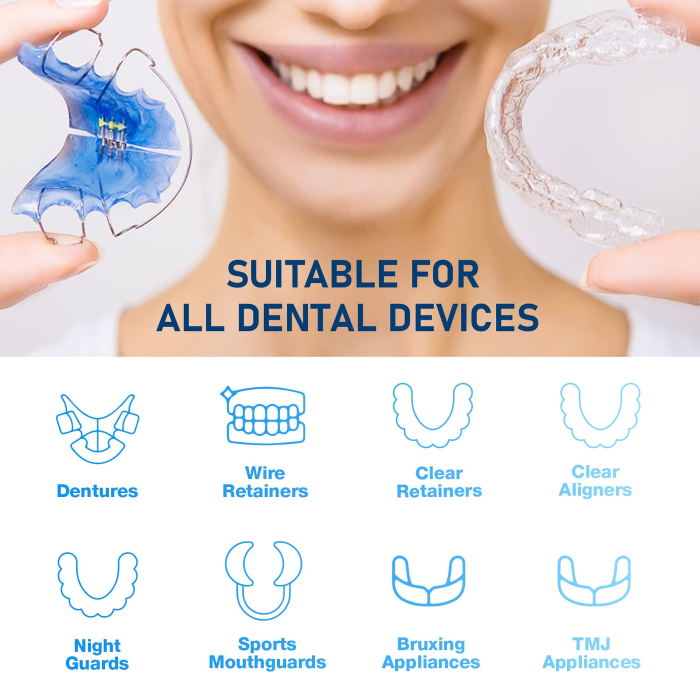 - Versatility and safety in oral appliance care: Non-abrasive formula. Bi-layer showers, gently care for retainers. Whether you rely on a mouth guard for teeth grinding or wear a retainer, our cleaner is designed to care for a variety of oral appliances, maintaining their clarity and ensuring they are in pristine condition.