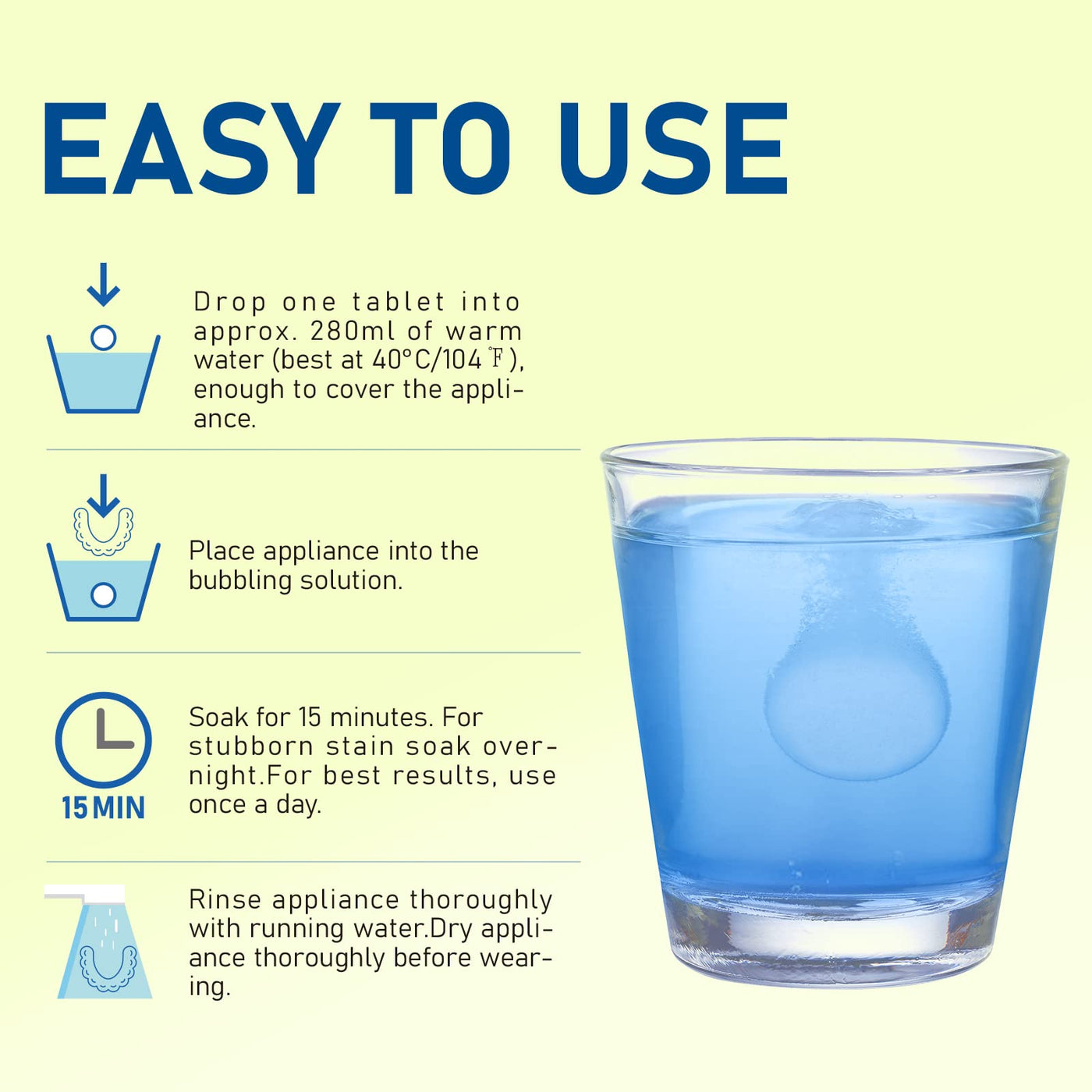 - Easy to use: Our new improved formula and safe cleaning ingredients provide a convenient and efficient solution to optimize braces care. All you need is a glass of water and an appropriate amount of orthodontic cleaning tablets. Your braces will be clean after just 15 minutes.