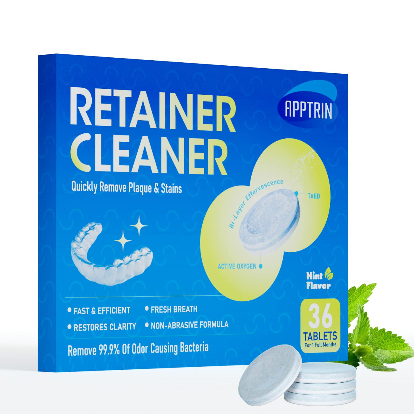 APPTRIN retainer cleaning tablets, braces cleaning tablets, 36 fresh retainer tablets, tabs for cleaning dentures, mouth guards, dentures