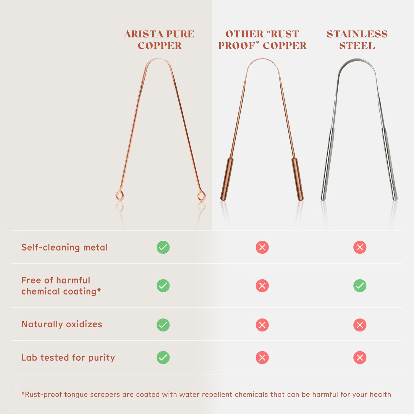 - 100% Pure Copper: Made from uncoated copper for true Ayurvedic benefits. This metal tongue scraper is naturally hygienic, and safer than coated rust-proof alternatives, that block coppers natural self-cleaning properties.