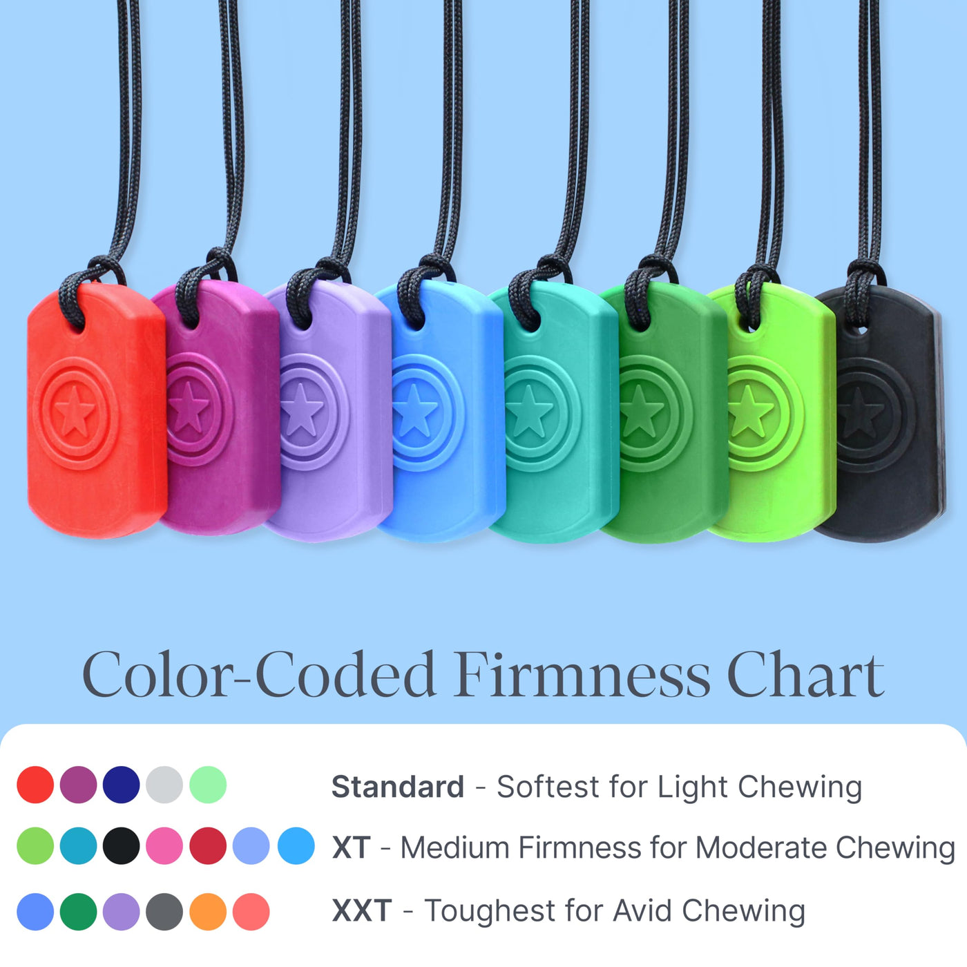 - WEARABLE & DURABLE: Discreet and easy to wear, the oral fidgets feature an adjustable 30" cord with a breakaway clasp. The Standard firmness is the softest variation and is meant for mild chewing. Age 3 years+
