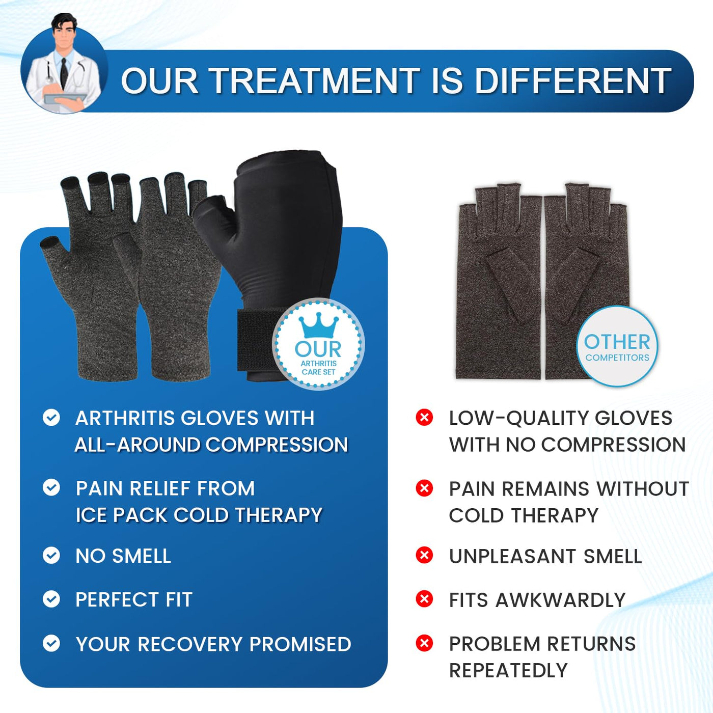 - RECLAIM YOUR DAY WITH RELIABLE RELIEF: Dont let hand pain slow you down. Our arthritis glove and ice pack set is designed to bring back comfort and confidence into your daily life. Whether youre typing at a desk, gardening, or just trying to get a good nights sleep, this combination of compression and cold therapy works to ease swelling, stiffness, and discomfort.