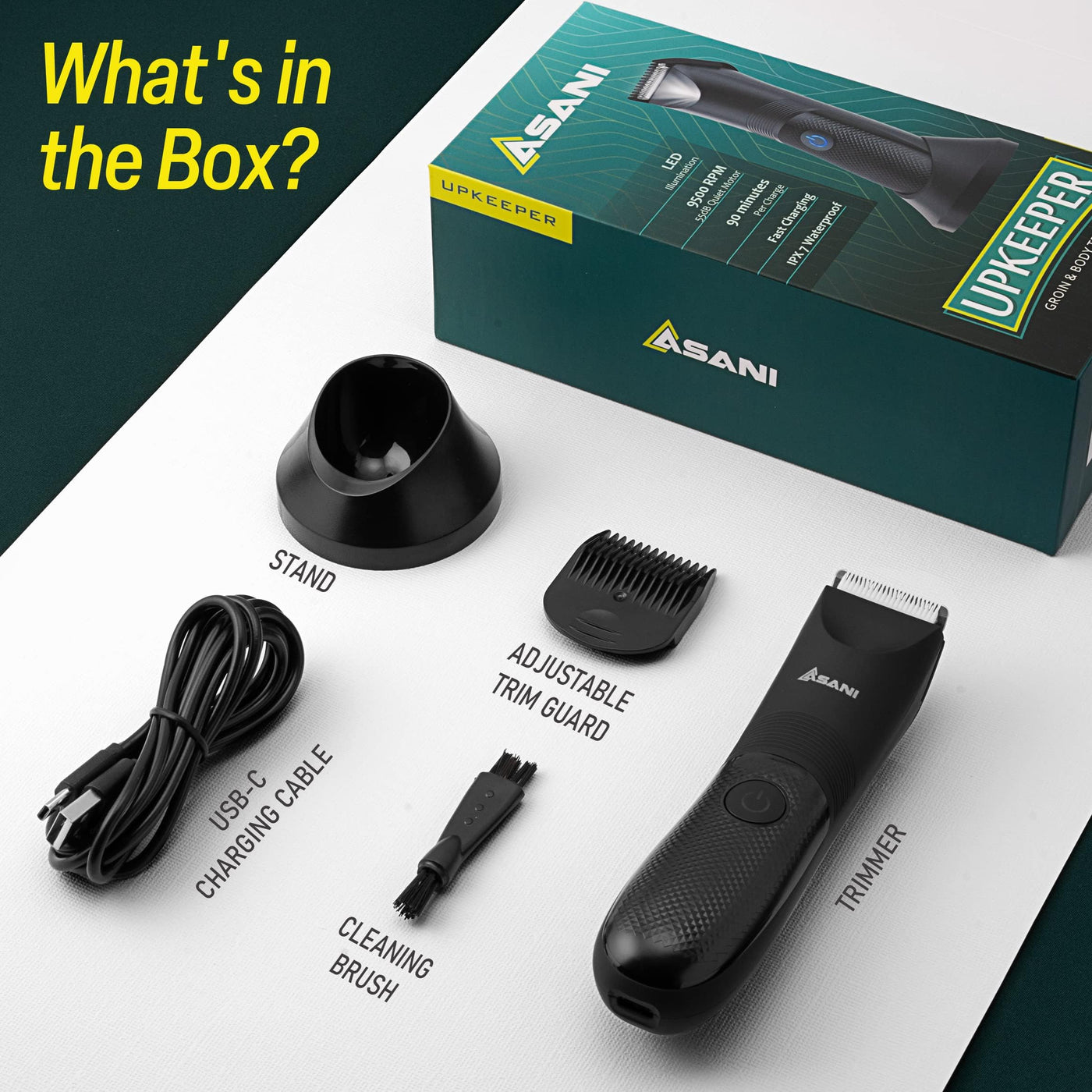 Asani Upkeeper Men's Body Hair Trimmer - Rechargeable Grooming Tool with Ceramic Blade, LED Light, Waterproof Design, Electric Shaver for Wet/Dry Use, Ideal for Chest, Back, Groin Hair Care