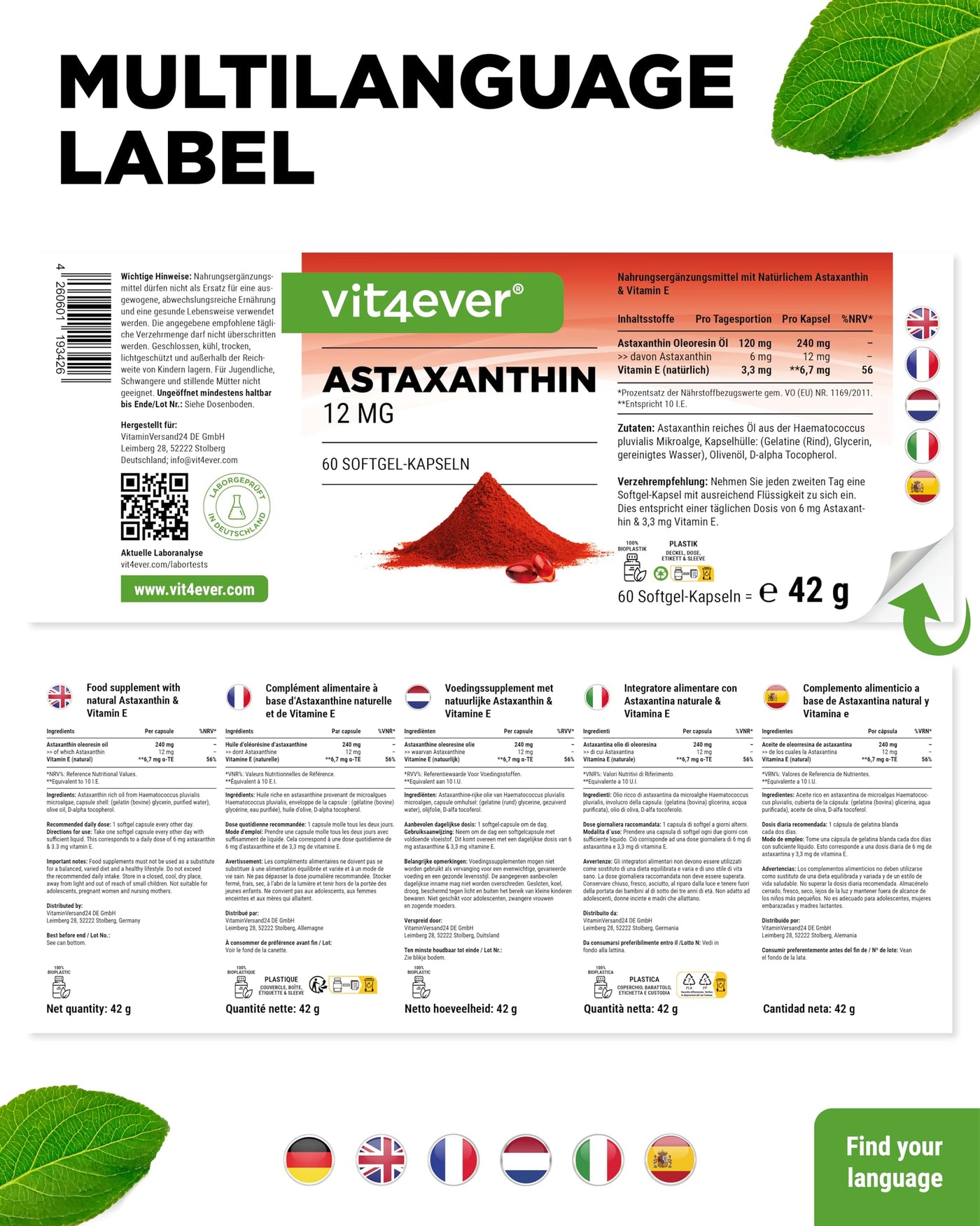 Astaxanthin 12 mg - 60 softgel capsules (4 month supply) - Made from Haematococcus Pluvialis microalgae - With vitamin E and olive oil