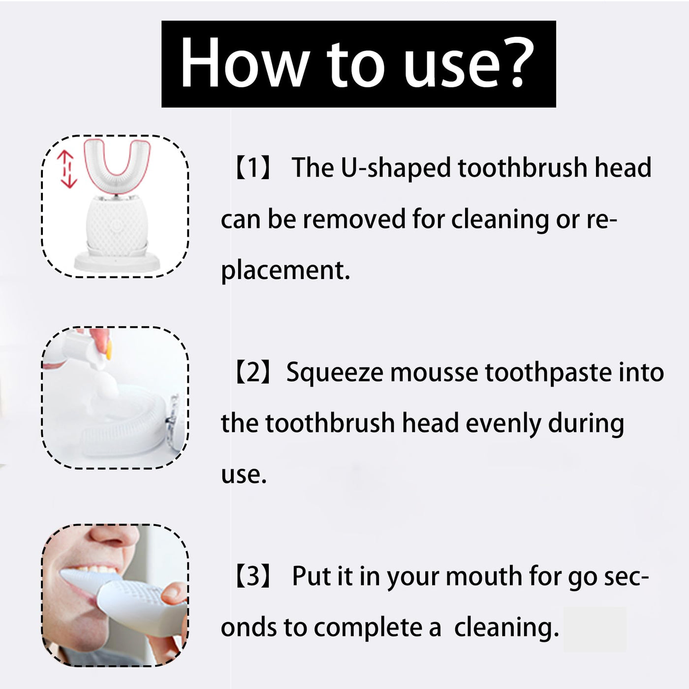 - Unique U-shape:U-shape toothbrush has a unique U-shape design to match the shape of the bite teeth.With high-frequency sound vibration, it can contact the teeth and gums in all directions to quickly and deeply clean the surface and interior of the teeth, thereby protecting the health of the teeth. (It works better with foam toothpaste)