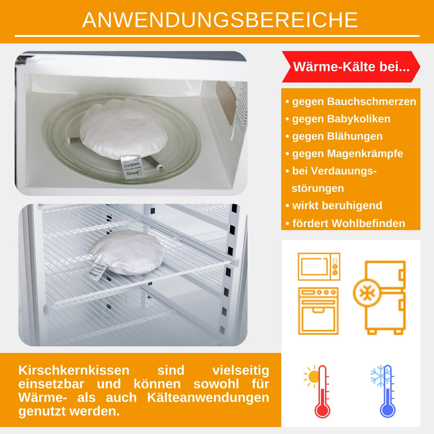 - Warm & Cold: Can be heated in the oven or microwave (only under supervision), cooled in the refrigerator for gentle cooling. Note: Please always use the cherry stone pillow under adult supervision. Check the temperature of the cushion before use to avoid burns.