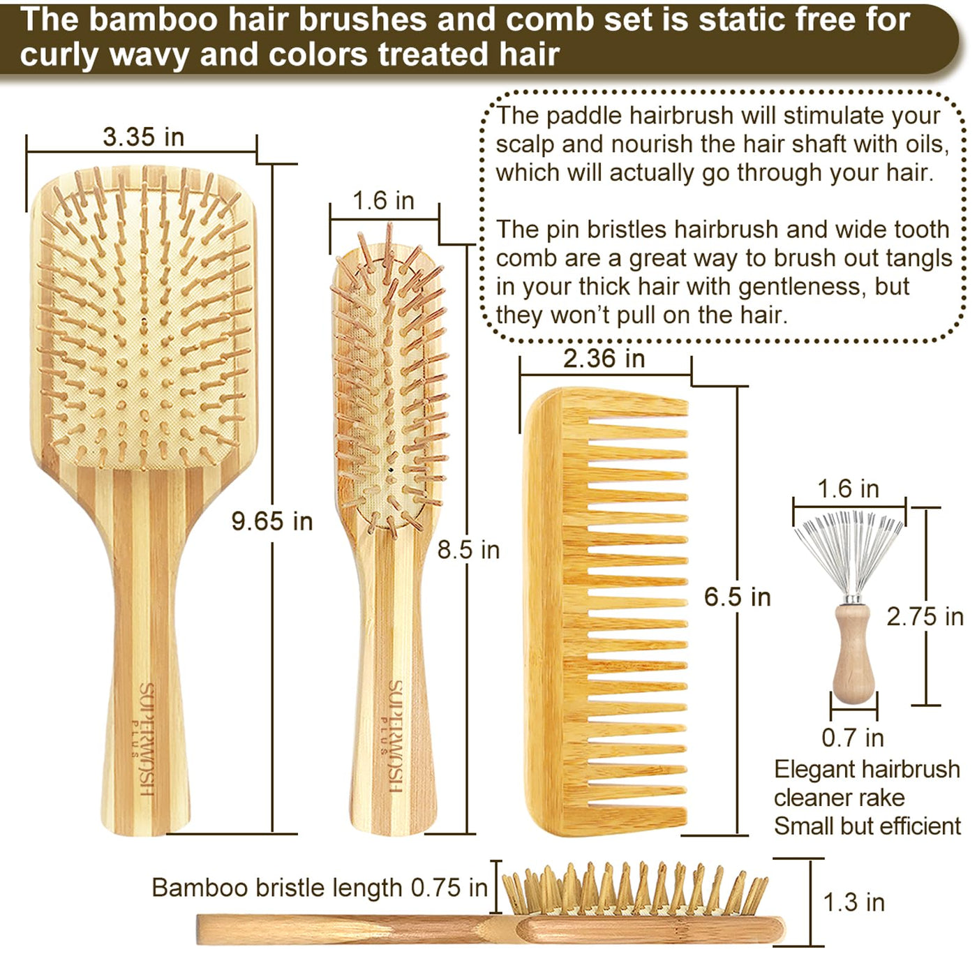 - Antistatic & Less Frizzy Hair The straight bristles glide smoothly through your hair, ensuring effective detangling without snagging on split ends. The wooden bamboo brush and comb are easy to clean. The wooden bristles are positioned perfectly to secure longer strands and prevent static, providing thorough relief from annoying flyaways. The bamboo paddle brush and comb are designed to keep your hair smooth and tangle-free, effortlessly managing thick and long hair without causing damage.