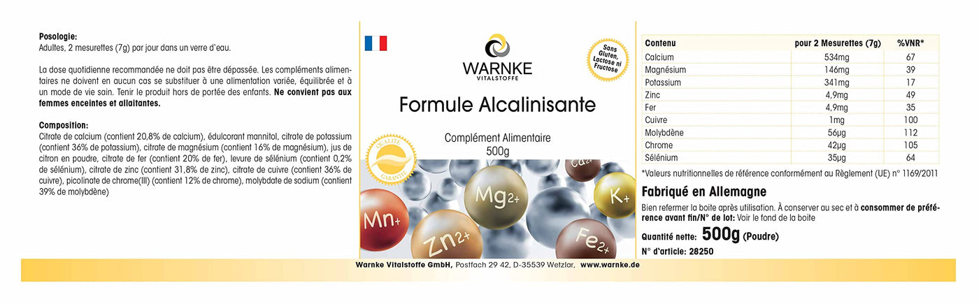 - Excellent price-performance ratio from Warnke Vitalstoffe: Base powder from our own production. Vital substance expertise for over 30 years! The daily dose of 2 measuring spoons contains 534mg calcium, 146mg magnesium, 341mg potassium, 4.9mg zinc, 4.9mg iron, 1mg copper, 56g molybdenum, 42g chromium, and 35g selenium. Zinc can contribute to a balanced acid-base balance