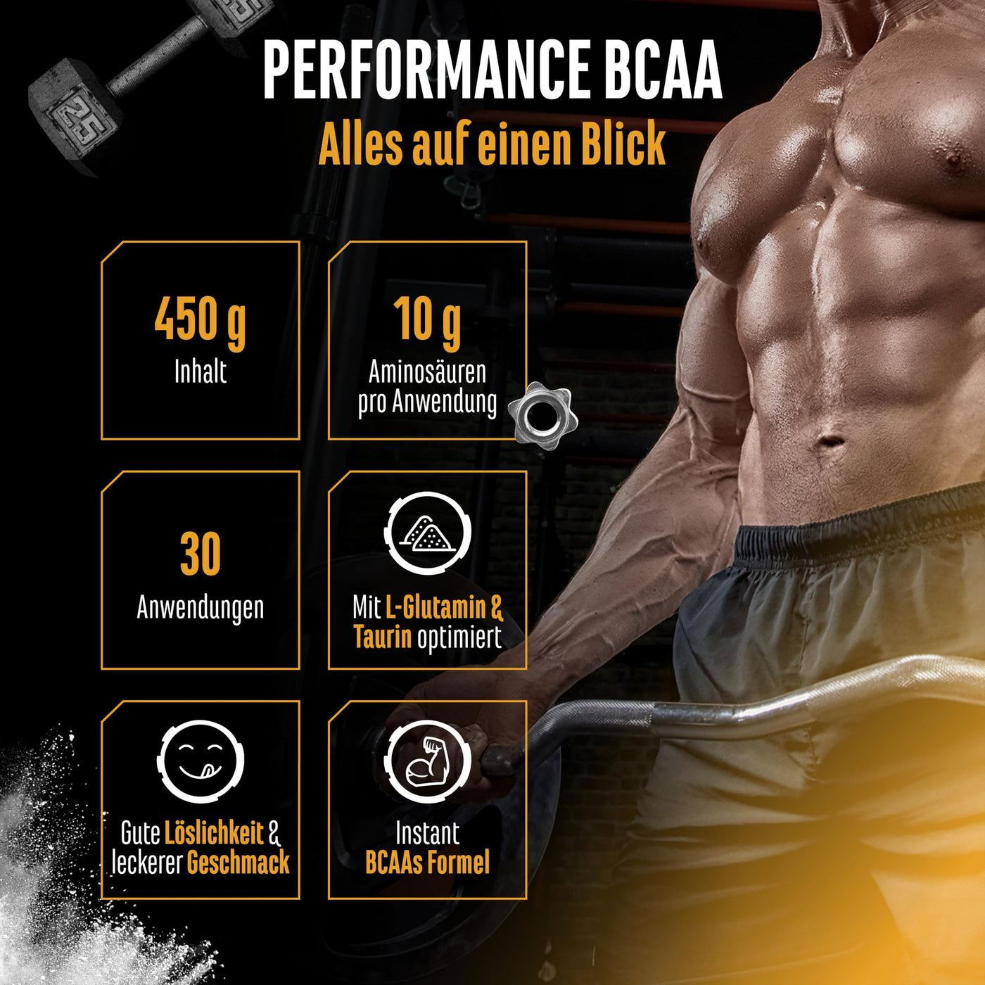 BCAA Performance - 450 g powder - Instant BCAAs + L-Glutamine + Taurine - Delicious & super solubility - vegan amino acids - 2:1:1 ratio - (mango passion fruit)