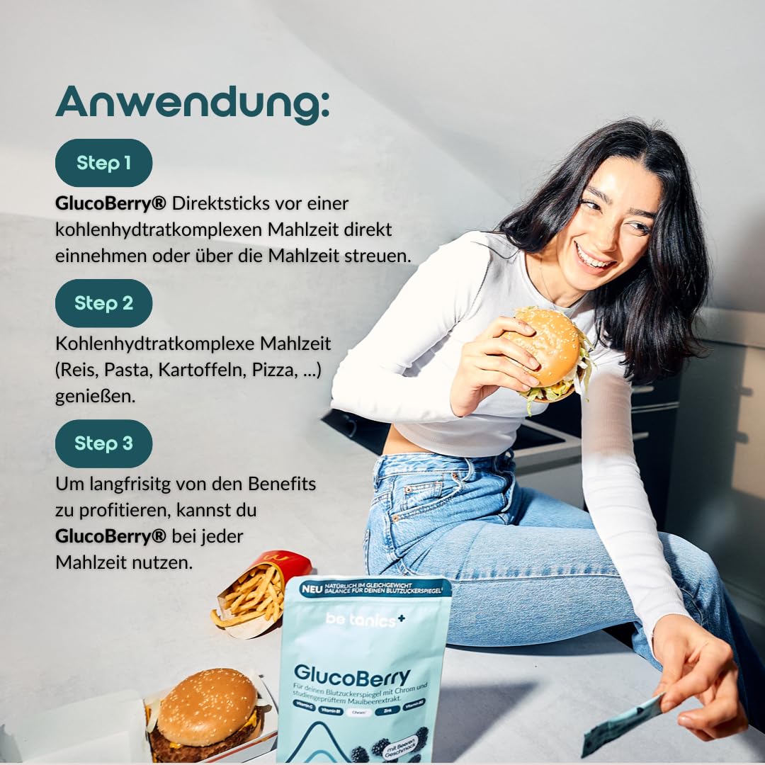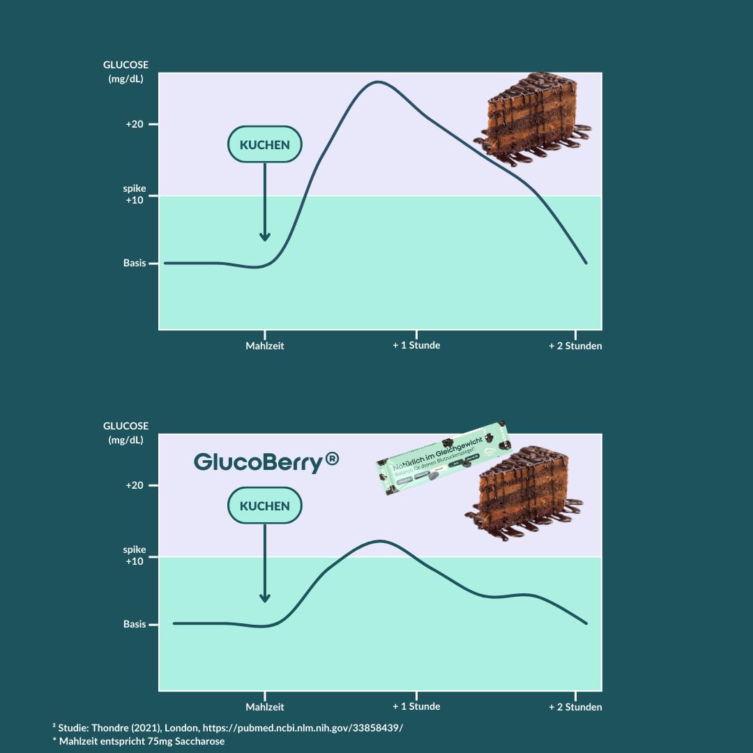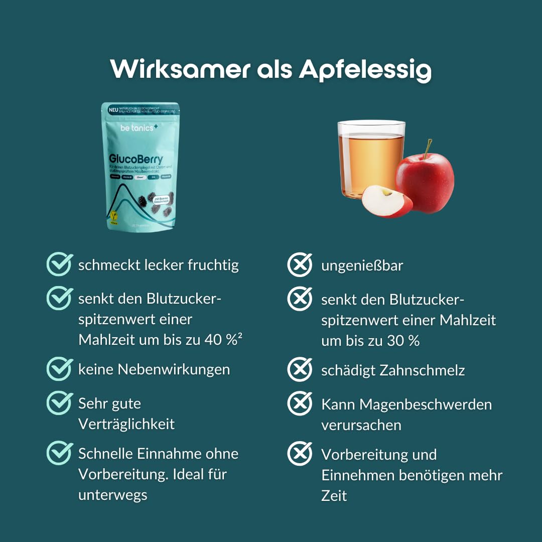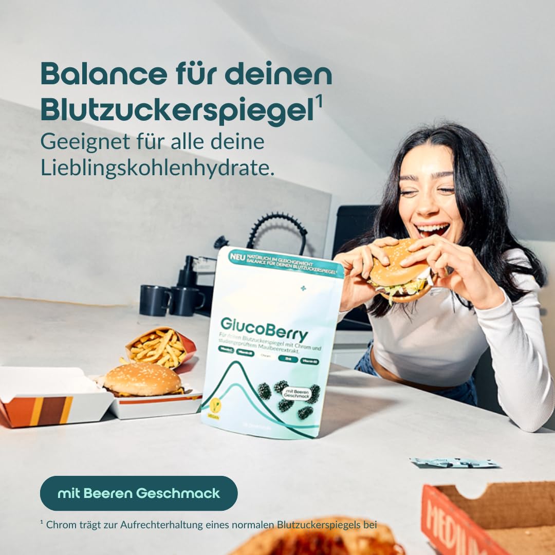 Product description Discover GlucoBerry, your innovative Dietary supplement for the natural stabilization of the blood sugar level¹. Our unique formula contains the patented Mulberry leaf extract Reducose, which is scientifically proven Blood sugar spikes after eating reduced by up to 40%. GlucoBerry unites the power of nature with the latest science to give you an effective Support for your metabolism and your general well-being offer. ¹Chromium contributes to maintaining normal blood sugar levels at² Chromium contributes to normal metabolism of macronutrients.³ Vitamin B1 contributes to normal heart function. ⁴ Vitamin C, Vitamin B1 and vitamin B2 contribute to normal energy metabolism. Zinc contributes to a normal carbohydrate and macronutrient metabolism.Vitamin C contributes to normal collagen formation for normal function blood vessels. Reducose is a study-tested and patented product proprietary mulberry extract. Reducose contributes to a normal Carbohydrate metabolism (based on existing studies). Ingredients / ingredients filler xylitol, mulberry leaf extract, Maltodextrin, L-leucine, vitamin C, beetroot juice powder, maltodextrin, Acidifier citric acid, aroma, thickener sodium Carboxymethylcellulose, zinc citrate, anti-caking agent magnesium salts fatty acids, sweeteners steviol glycosides from stevia, vitamin B2, Vitamin B1, chromium (III) chloride. P.when('A').execute(function(A) { A.on('a:expander:toggle_description:toggle:collapse', function(data) { window.scroll(0, data.expander.$expander[0].offsetTop-100); }); }); Address Manufacturer/Importer be tanics GmbH More