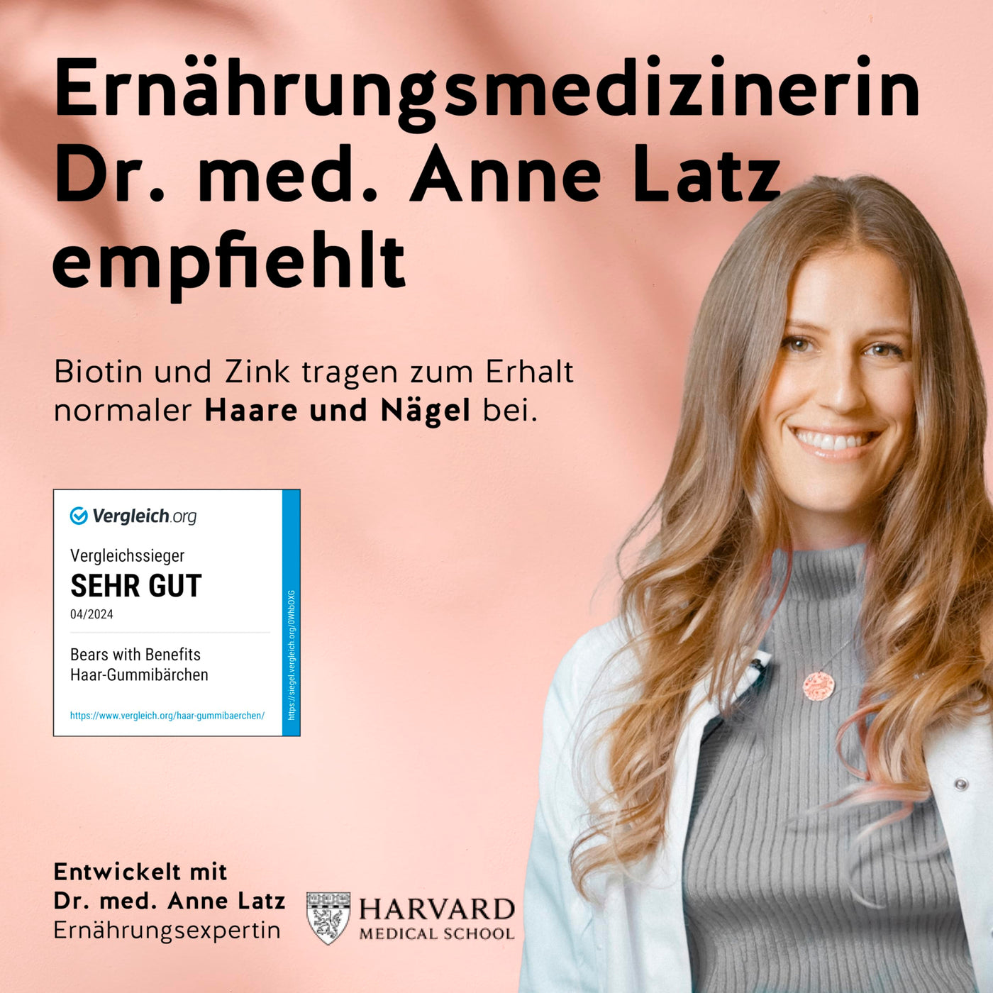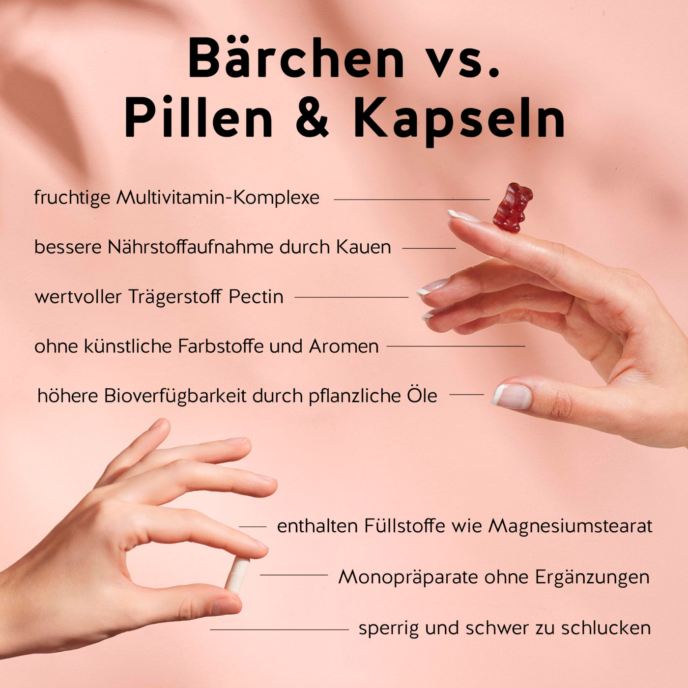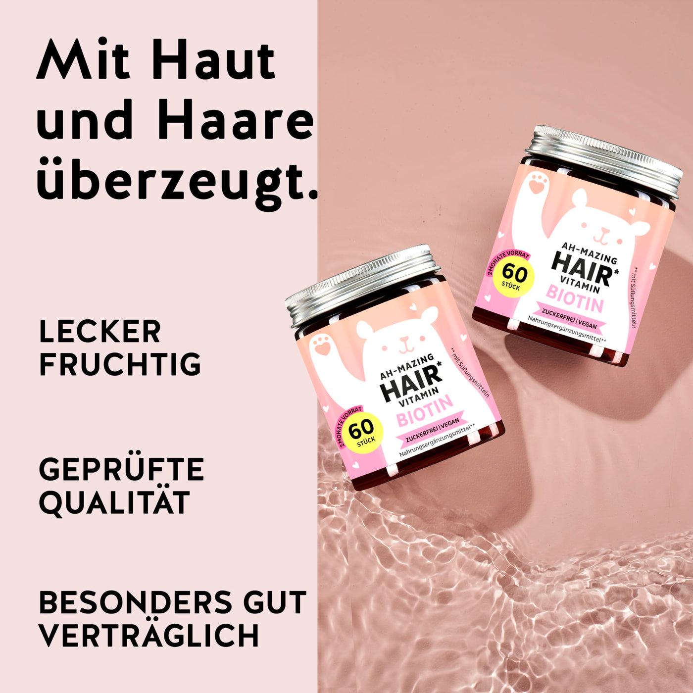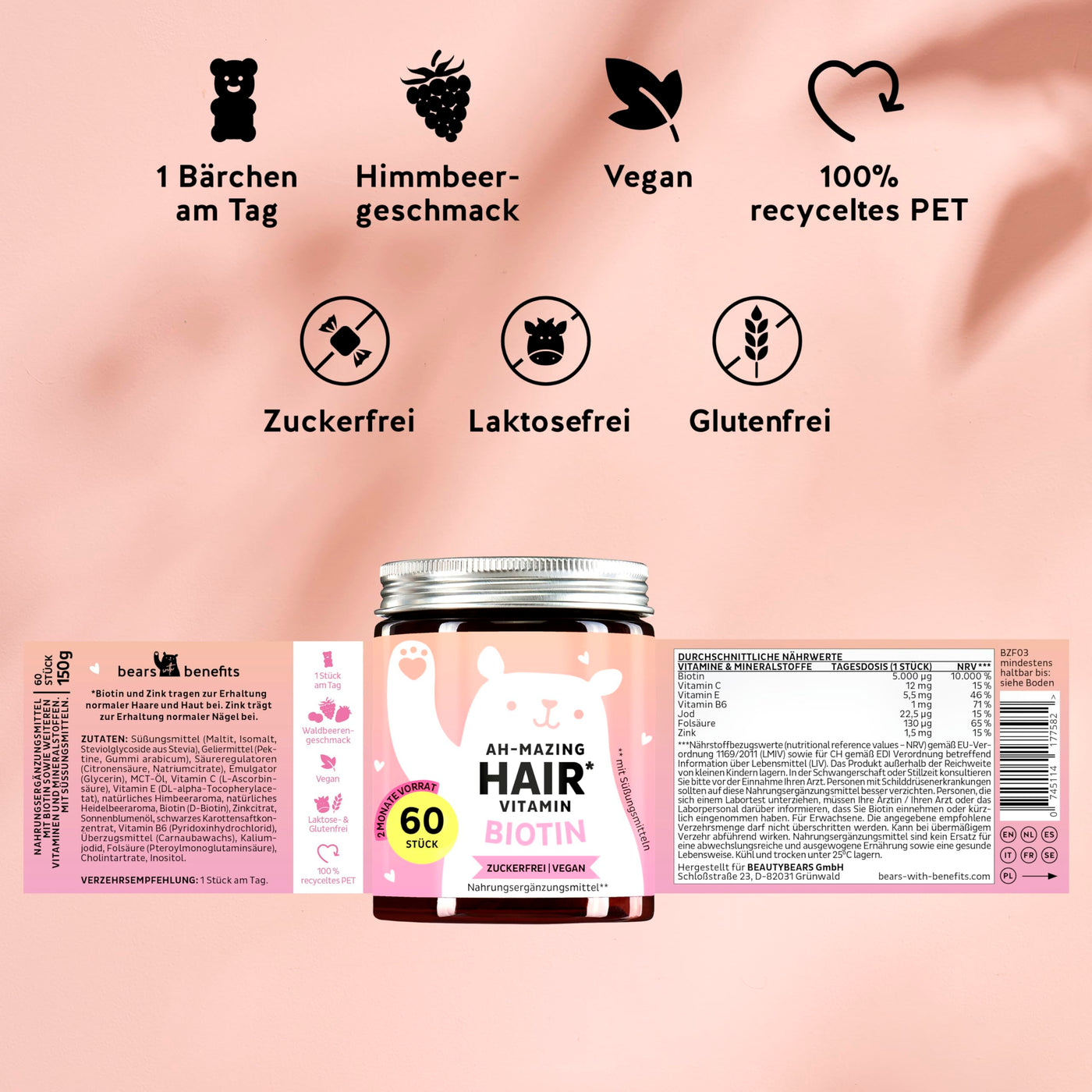 Product Description Our AH-MAZING HAIR Vitamins contain BvGummies a highly concentrated hair vitamin complex with 5,000 mcg of biotin per bear. Biotin contributes to normal energy metabolism and the maintenance of normal hair and skin. The intelligent active ingredient complex is also through Vitamin B5, B6 and zinc, folic acid, vitamin C, vitamin E, inositol, Pantothenic acid (vitamin B5) and high-quality coconut oil supplemented. As Our biotin bears contain plant-based sweeteners instead of sugar Stevia and are ideal for long-term consumption. Ingredients/Ingredients sweetener (maltitol), modified starch, acidulant (citric acid), L-ascorbic acid, natural flavor, DL-alpha-tocopheryl acetate, D-biotin, coloring foods (sweet potato concentrate, carrot concentrate), vegetable oils (coconut, rapeseed), sweeteners (steviol glycosides from stevia), Zinc gluconate, pyridoxine hydrochloride, coating agent (carnauba wax), Pteroyl monoglutamic acid, potassium iodide, inositol, choline tartrate. P.when('A').execute(function(A) { A.on('a:expander:toggle_description:toggle:collapse', function(data) { window.scroll(0, data.expander.$expander[0].offsetTop-100); }); }); Instructions for use Keep the product out of the reach of small children store. If you are pregnant or breastfeeding, please consult before Take your doctor. The stated recommended daily consumption amount may not be exceeded. Can have a laxative effect if consumed in excess. Dietary supplements are not a substitute for a varied and balanced diet and a healthy lifestyle. Cool and dry underneath Store at 25°C. Warnings Keep the product out of the reach of small children store for children. If you are pregnant or breastfeeding, please consult consult your doctor before taking. The stated recommended daily consumption amount must not be exceeded. Can be laxative if consumed in excess works. Dietary supplements are not a substitute for a varied diet and balanced nutrition and a healthy lifestyle. Cool and dry store below 25°C. Address of manufacturer/importer Beautybears GmbH Schloßstrasse 23 82031 Grünwald Email: More