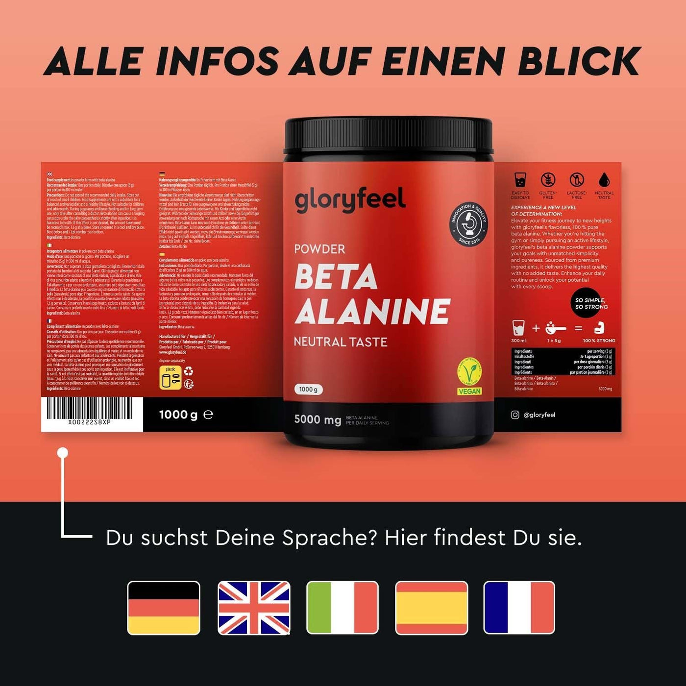 - BEST QUALITY & STABILITY: WE REALLY GET WHAT'S ON IT In order to be able to offer our customers only the best ingredients, quality and stability are our top priority. All gloryfeel products undergo strict stability tests that go far beyond industry standards. In this way, we ensure constant effectiveness and set new standards in the industry. We are proud of our leadership in quality assurance. With production in Germany according to the highest standards (ISO, HACCP certified), you can be sure: We really do what it says on the tin. Certificates of Analysis are available.