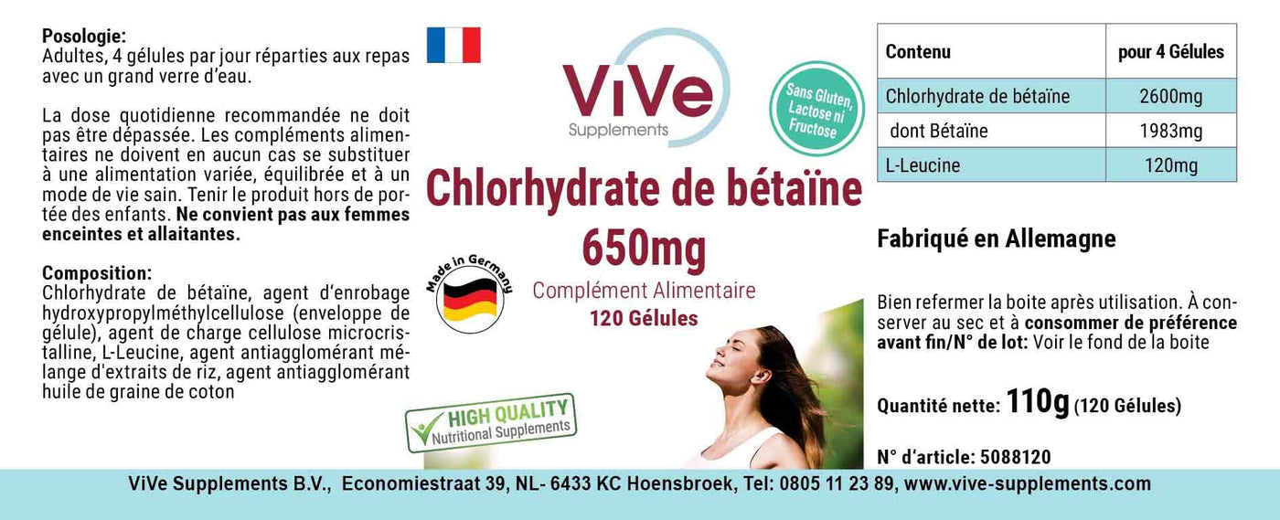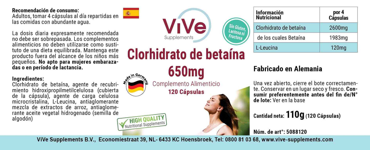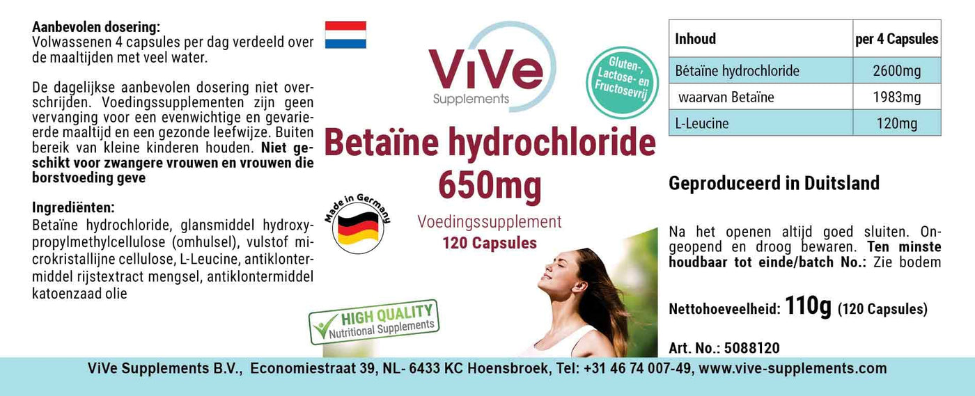 Betaine hydrochloride 650 mg - 120 capsules for 1 month - 76% betaine - high dosage and vegan | Quality from Germany from ViVe Supplements