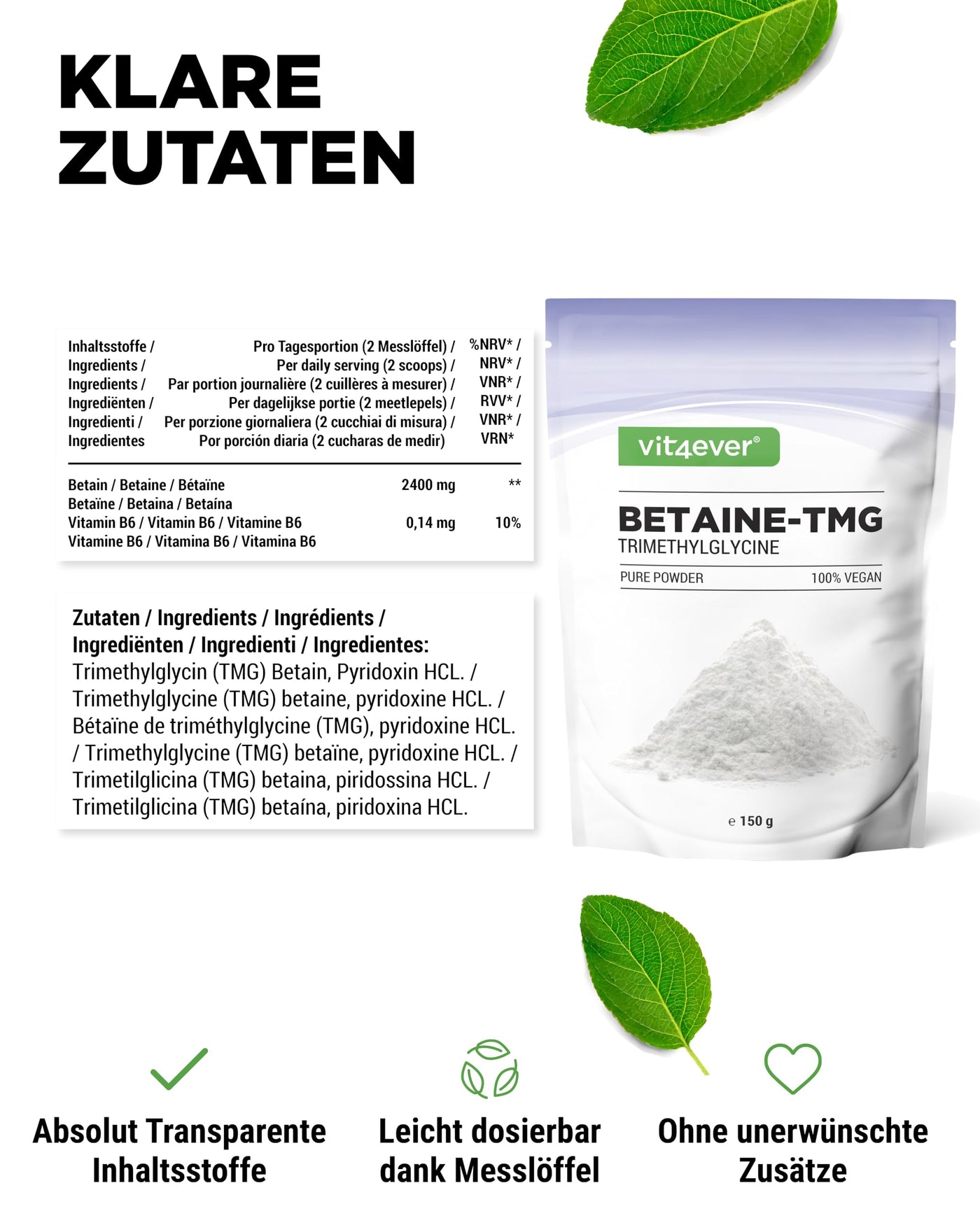 - DIRECT BIOACTIVE TMG betaine: TMG betaine is the activated form of choline and is directly available to the body. With 150g of pure Betaine TMG powder, the product provides a 2-month supply for over 60 uses. Thanks to the practical measuring spoon, dosing is uncomplicated and precise, perfect for daily supplies.