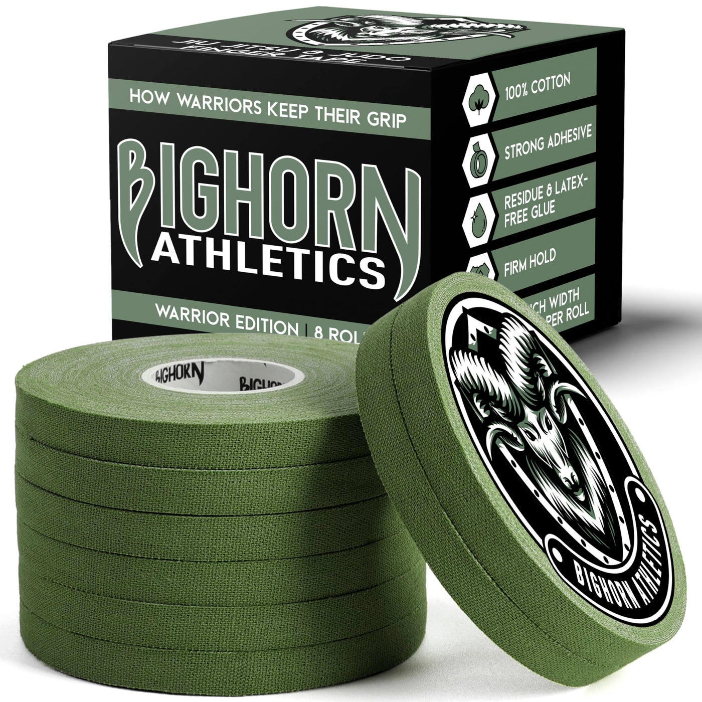 Bighorn Athletics Jiu Jitsu Finger Tape | Athletic Sports Tape for Injuries & Support: BJJ, Judo, MMA, Rock Climbing, Volleyball, Crossfit, Hands & Toes | 0.3-Inch x 45-feet, 8-Rolls, Military Green
