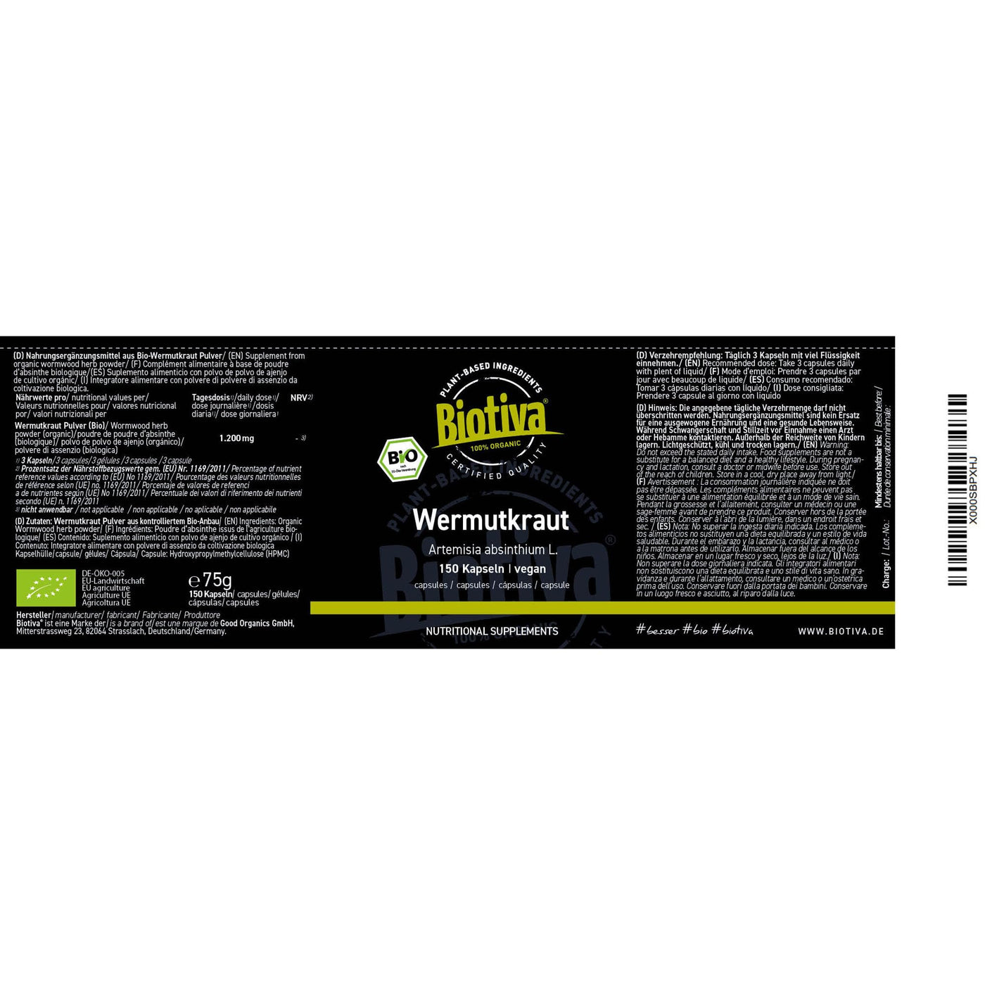 Biotiva wormwood capsules organic 150 pieces - 400 mg - wormwood - guaranteed without additives - filled and controlled in Germany (DE-ÖKO-005) 150 pieces (pack of 1)