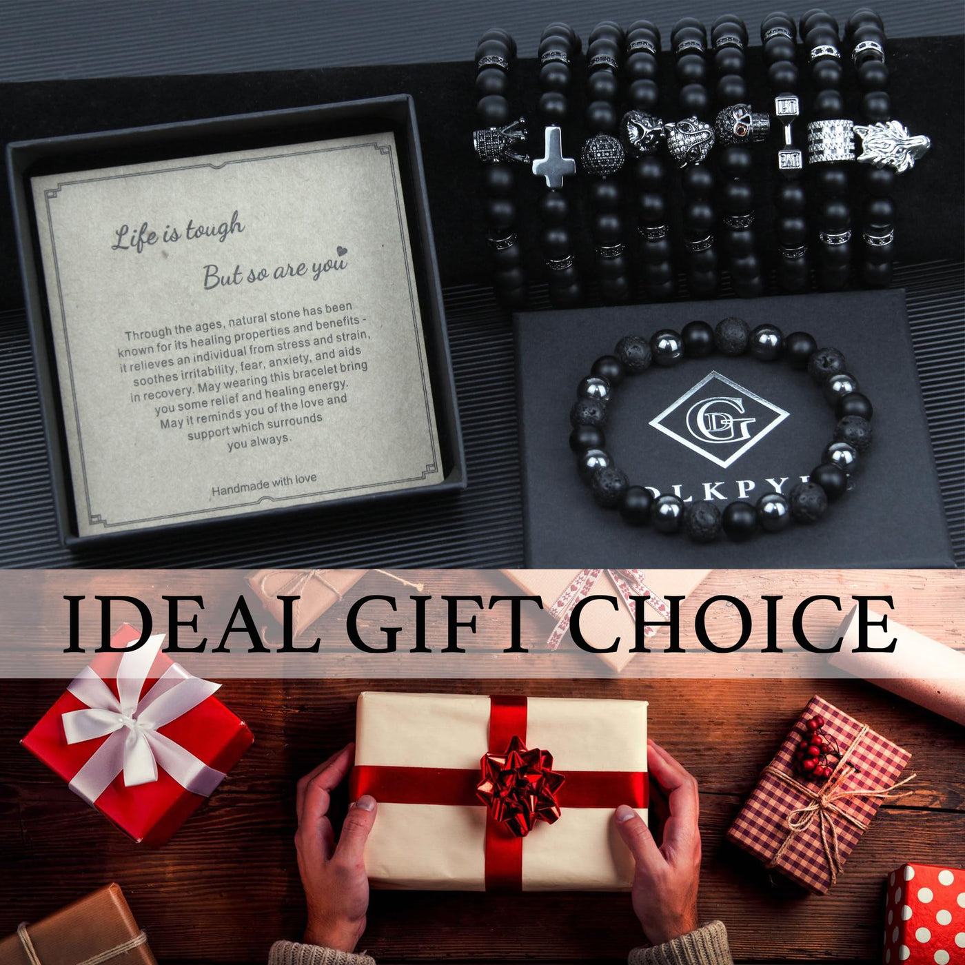 Black Obsidian Bracelet for Men - Black Tourmaline Beaded Bracelets - Mens Bracelet Set 8MM Black Onyx Hematite Lava Stone Beads Triple Protection Bracelet for Men Women Gifts Skull
