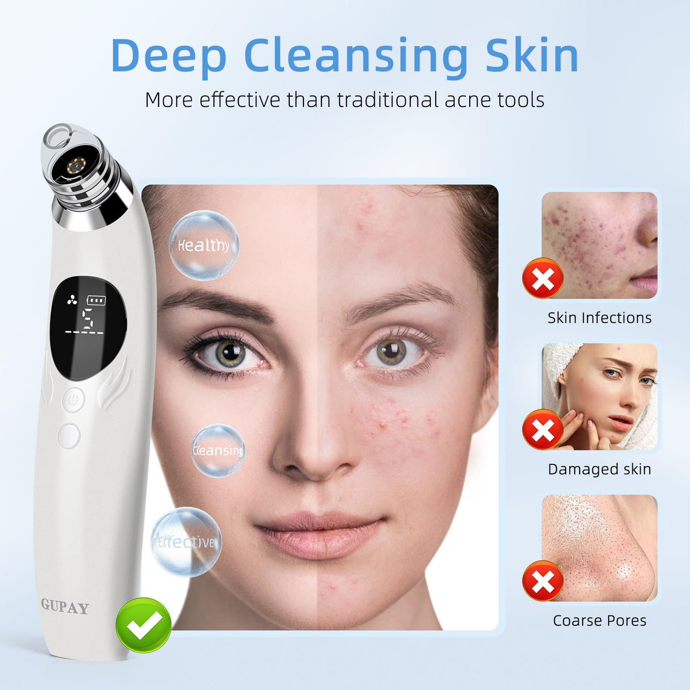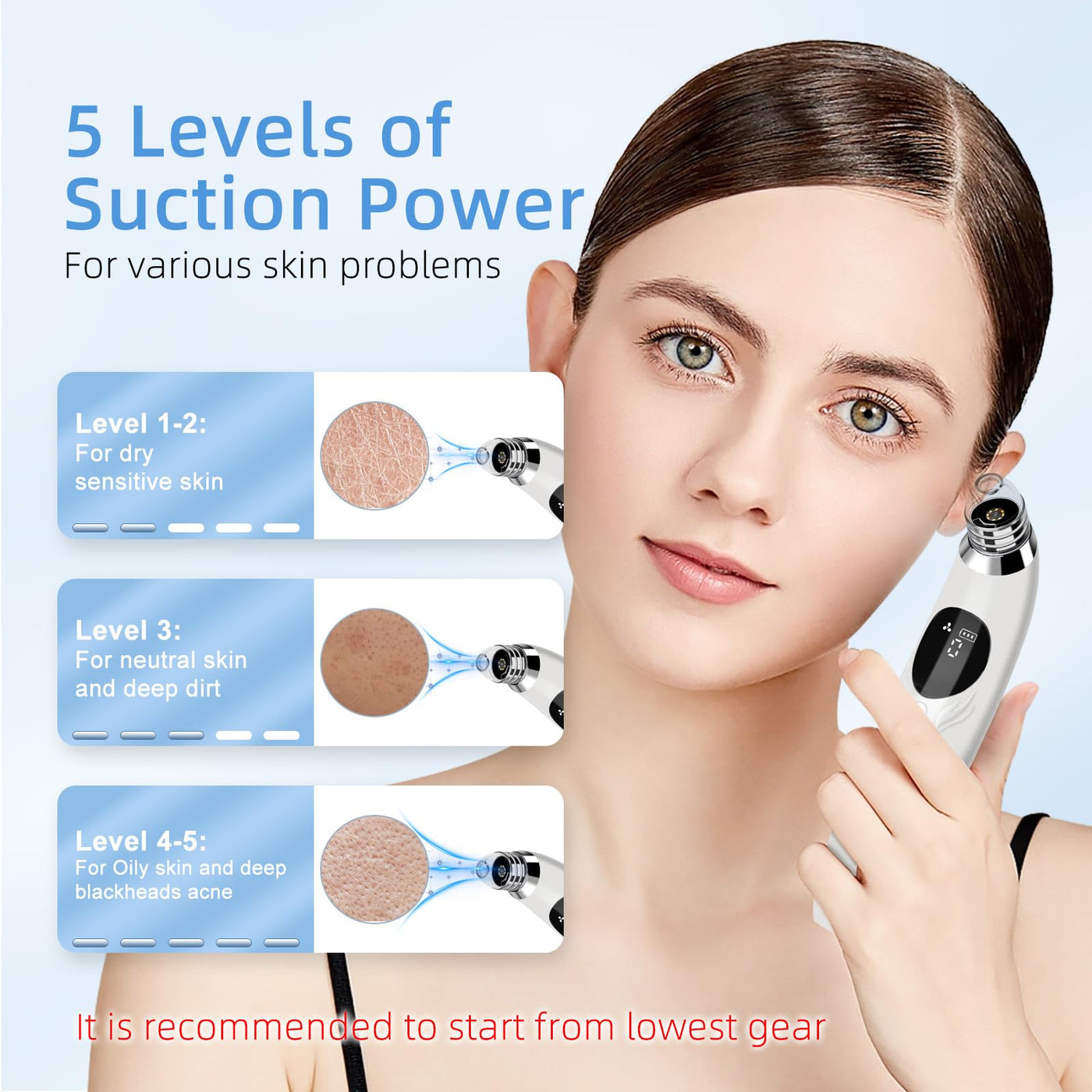 - Comes with 4 Suction Probes and 5 Suction Levels 4 replaceable blackhead vacuum probes, choose different probes according to your facial skin condition, you can try it on your hands for the first time, 5 suction levels are suitable for different types of skin, strong suction can be used for stubborn blackheads to achieve real deep cleaning. It can adapt to different skin types through different accessories.