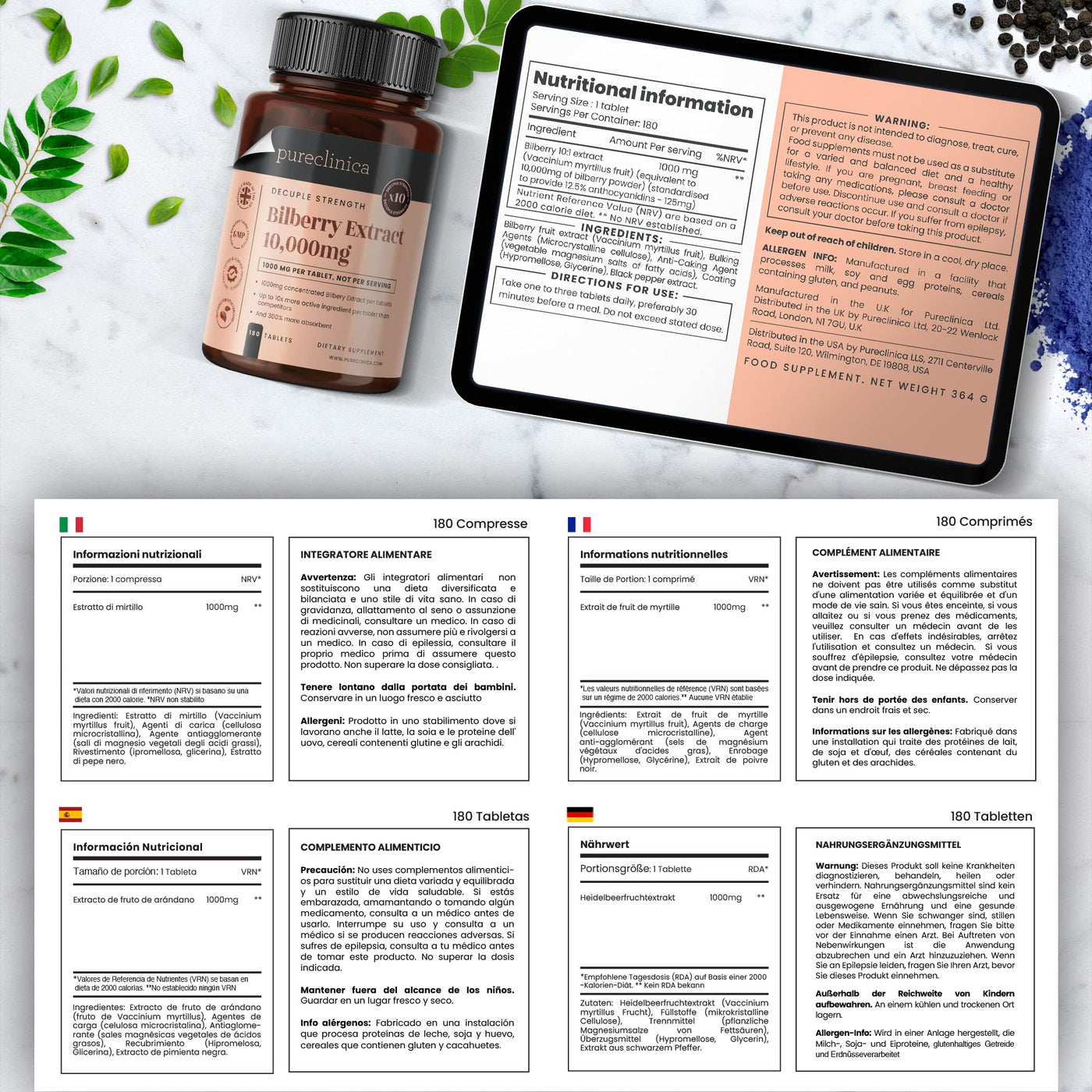 Blueberry extract 10,000 mg x 180 tablets - 10x more anthocyanidins per tablet than most competitor products - plus 5 mg of piperine (black pepper extract) for 300% better absorption