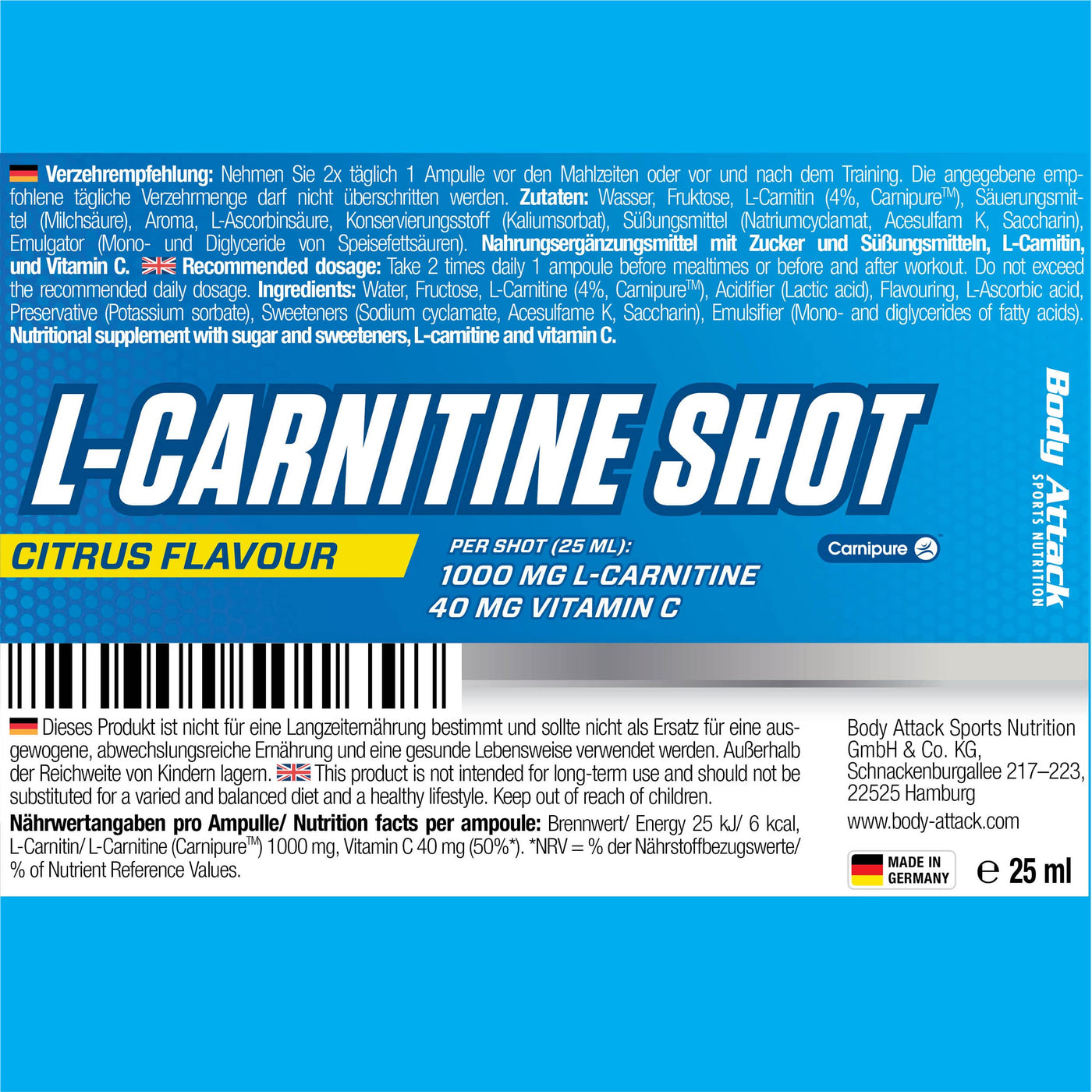 Body Attack L-Carnitine Shots, lemon, pack of 1 (20x 25 ml)