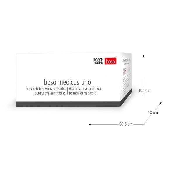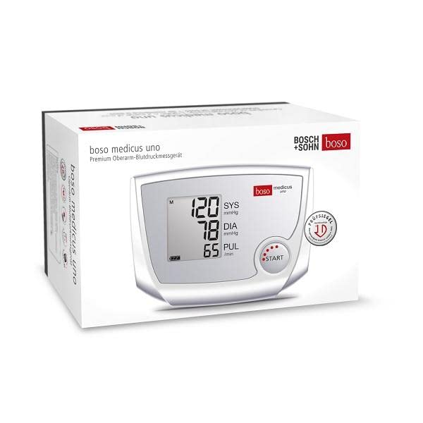 boso medicus uno blood pressure monitorThe blood pressure provides important information Information about your health status and should therefore be measured regularly become. The blood pressure monitors from boso impress with their high quality Quality and precision and help you step into a long and healthy life Life! The medicus uno model is particularly easy to use very popular. The blood pressure monitor automatically saves the last measurement and displays this when you switch it on again - ideal for a simple and easy blood pressure measurement Home!Product features:Fully automatic blood pressure monitor for Measurement on the upper armLarge display with 3 values displayWith arrhythmia detection – indicates cardiac arrhythmias. Intelligent automatic inflation for a measurement without re-pumpingWith the test seal of the German High Pressure League – Measuring accuracy clinically validated in 2005Scope of delivery: 1x blood pressure monitor, 1x upper arm cuff, 1x batteries, 1x instruction manual, 1x Blood pressure passboso - premium quality for health: Bosch + Sohn GmbH and Co. KG, boso for short, is a German manufacturer that specializes in... specializes in the manufacture of blood pressure monitors. Many of the boso Blood pressure monitors are popular thanks to their high quality and highest precision in the Stiftung Warentest product tests among the first. In addition, boso also successfully produces other health accessories as well as various heat wellness products.