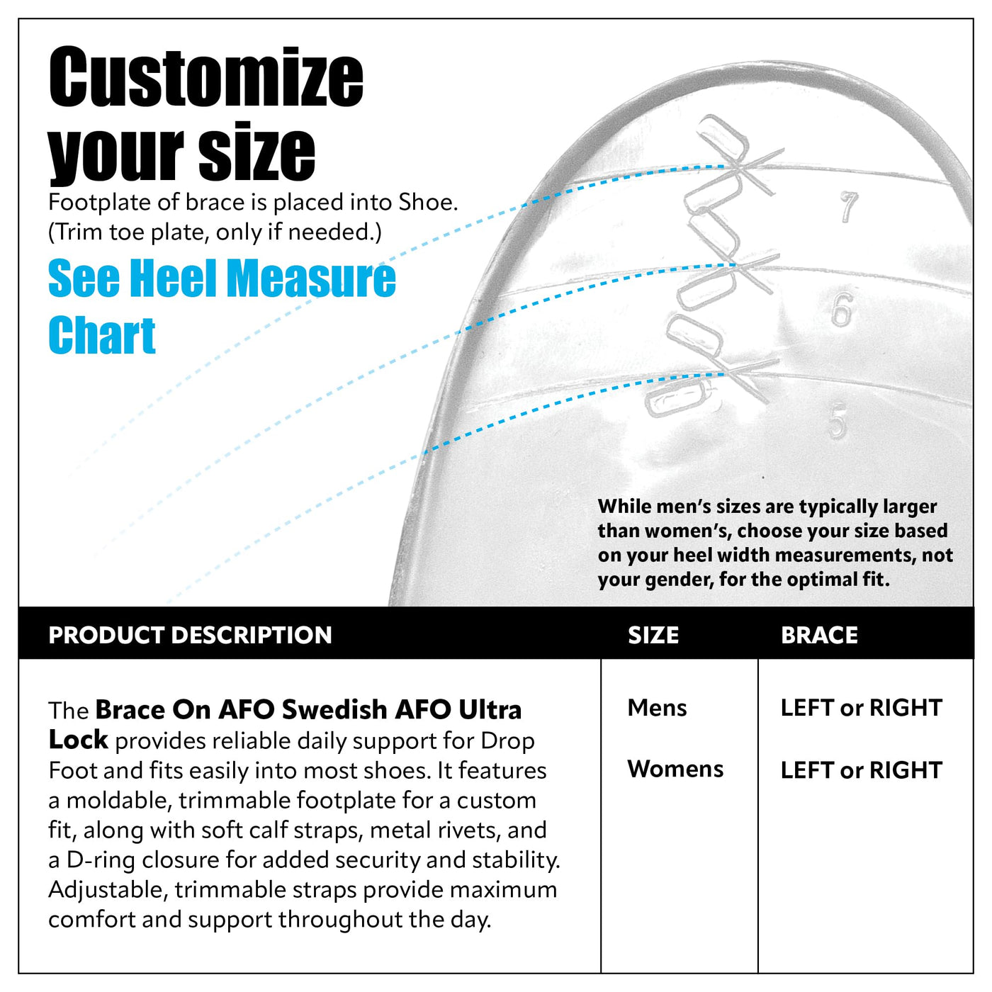 Two Steps Forward in Foot Drop Support For individuals dealing with the day- to-day challenge of foot drop or suffer from foot and ankle instability, remaining independently mobile can be quite a task. The potential for stumbles and falls is a constant danger. The Swedish AFO Ultra Lock by Brace On is designed specifically to provide the required ankle support and joint stability to help minimize the risk.Foot drop makes it difficult to lift the front part of your foot, so it might drag on the floor when you walk. This can cause you to raise your thigh when you walk, as though climbing stairs (steppage gait), to help your foot clear the floor. This unusual gait might cause you to slap your foot down onto the floor with each step.Constructed of lightweight and flexible injection molded polyethylene with soft calf and straps and a D-Ring closure for complete compression, the Swedish AFO Ultra Lock provides all the strength to keep you on the go, and because it can be taken on and off so easily, you can decide when you want to wear it.The open heel and lower calf design combined with its lightweight low-profile, and moldable and trimmable footplate means it can be worn inside most shoes. Available as Left or Right, Mens or Womens.Product Benefits: Provides ankle and joint stability Helps reduce stumbles and falls Lightweight and flexible D-Ring closure for optimal compression Ability to be trimmed for custom fit Can be worn inside most shoes Available Left or Right, Men’s or Women’s