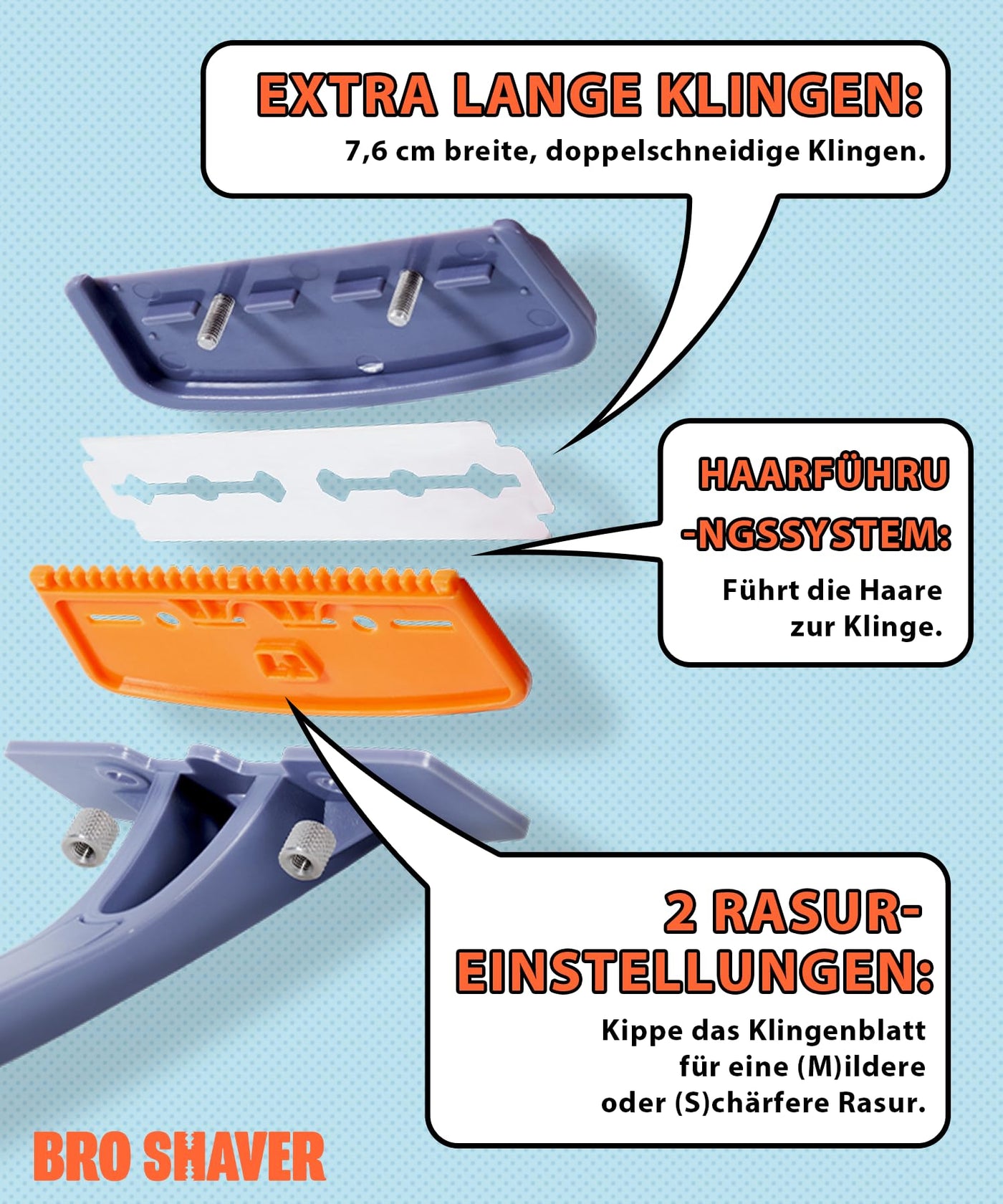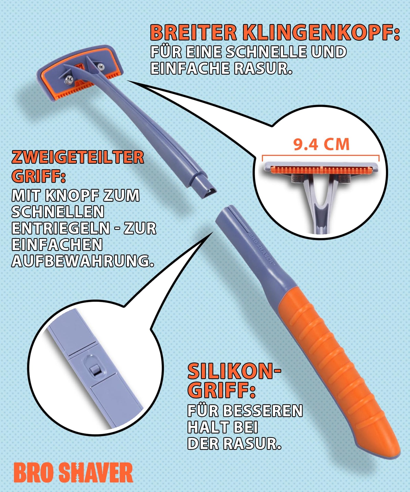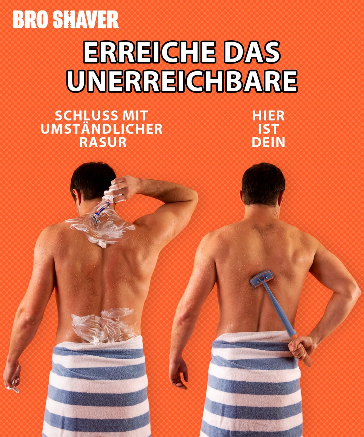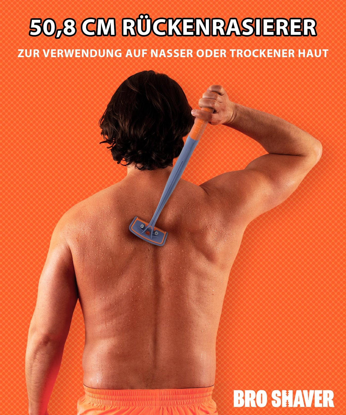BRO SHAVER 3.0, back shaver for men (DIY) back & Body hair trimmer Shave wet or dry back hair Ergonomic handle uses double-sided razor blades