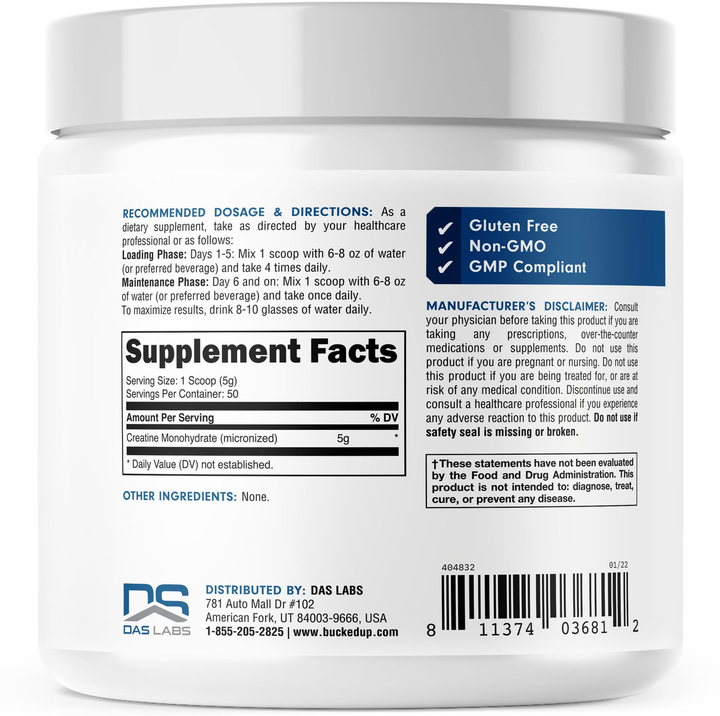 Bucked Up Creatine Monohydrate 250 Grams Micronized Powder, Essentials (50 Servings)