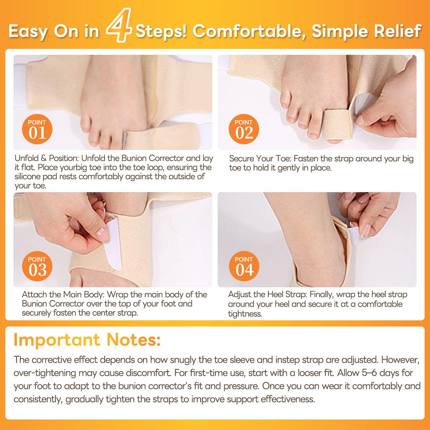 - Important Notes:The corrective effect depends on how snugly the toe sleeve and instep strap are adjusted. However, over-tightening may cause discomfort. For first-time use, start with a looser fit. Allow 56 days for your foot to adapt to the fit and pressure. Once you can wear it comfortably and consistently, gradually tighten the straps to improve support effectiveness. Note: It typically takes about 1 week for feet to adjust to the bunion corrector, though this may vary based on individual foot conditions.