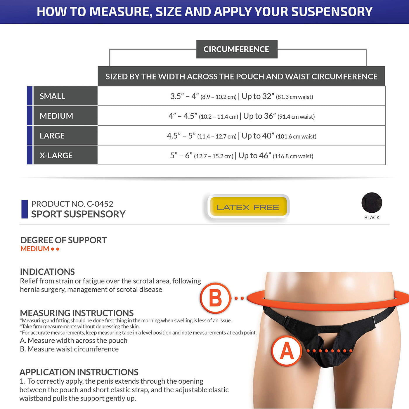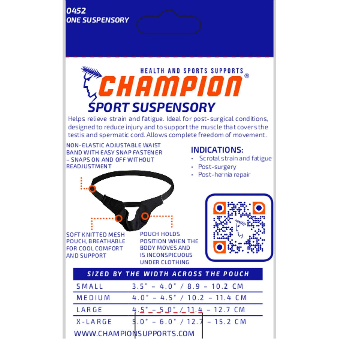 Champion brand (model C-425) suspensory. This suspensory helps relieve strain and fatigue. Ideal for post-surgical conditions, designed to reduce injury and to support the muscle that covers the testis and spermatic cord. Allows complete freedom of movement.