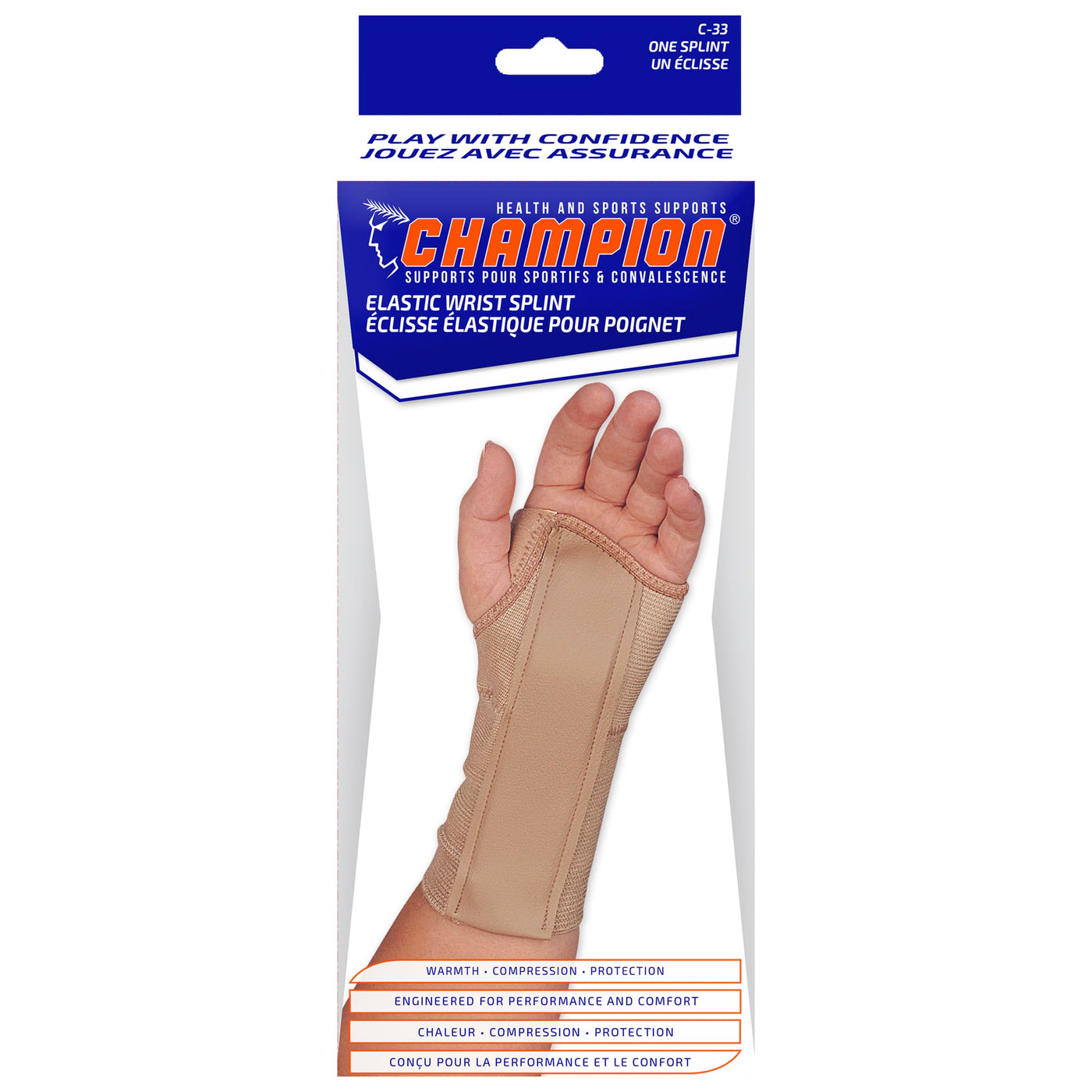 Champion brand (model C-50/33) elastic wrist splint. Specially shaped to hold the hand and wrist in the position recommended by physicians for correct healing of sprains, strains and other injuries. It is also suitable for those affected by arthritis and occupational-related discomfort. Use For: Mild to moderate wrist sprains, strains, carpal tunnel syndrome, post-cast application