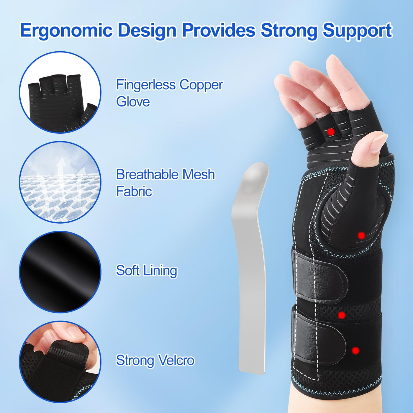 - STRONG WRIST SUPPORT: The scientific design of the Carpal Tunnel hand splint consists of 1 removable metal wrist splint and 2 plastic strips to form a maximum support structure. The ergonomic support structure keeps your wrist and hand safe, secure and supported, providing protection and accelerating recovery