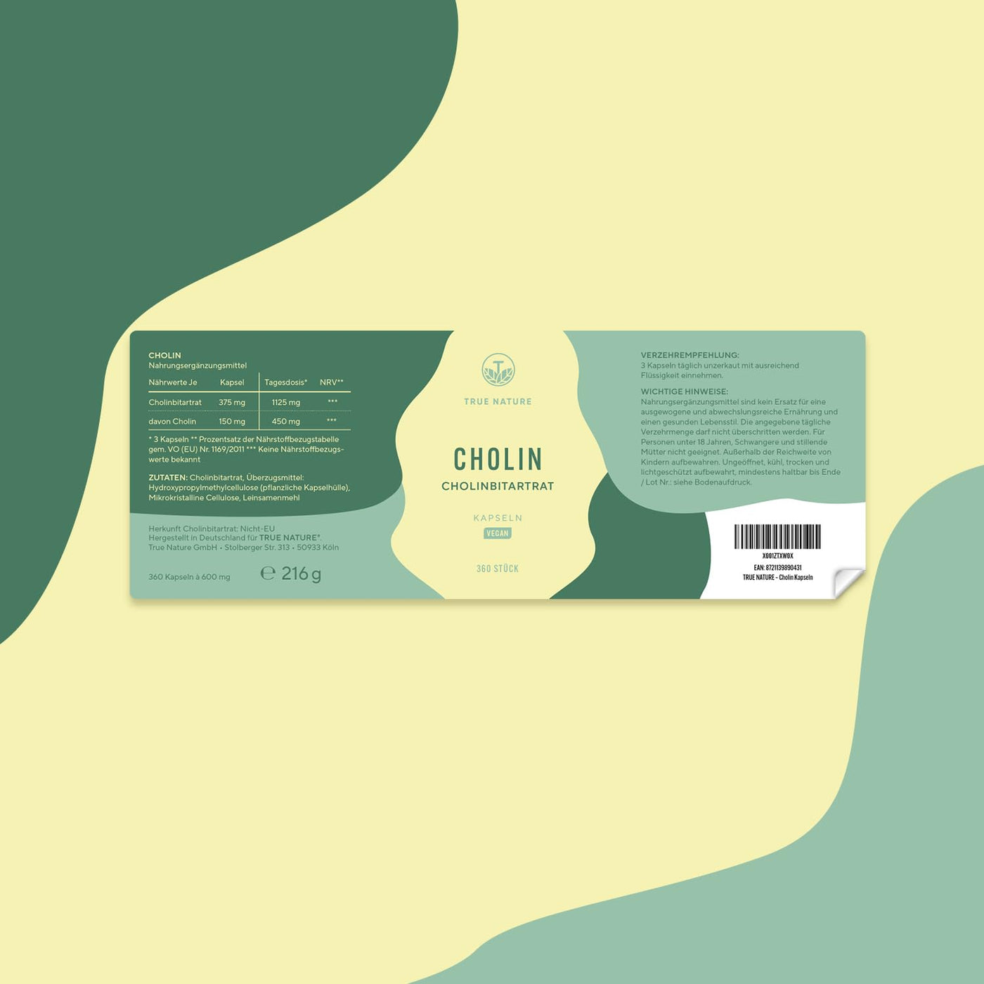 Choline capsules - high dose: 1125mg - 360 capsules (4 months) - choline bitartrate - *liver cure, homocysteine & Fat metabolism (EFSA) - Vegan, German production - TRUE NATURE®
