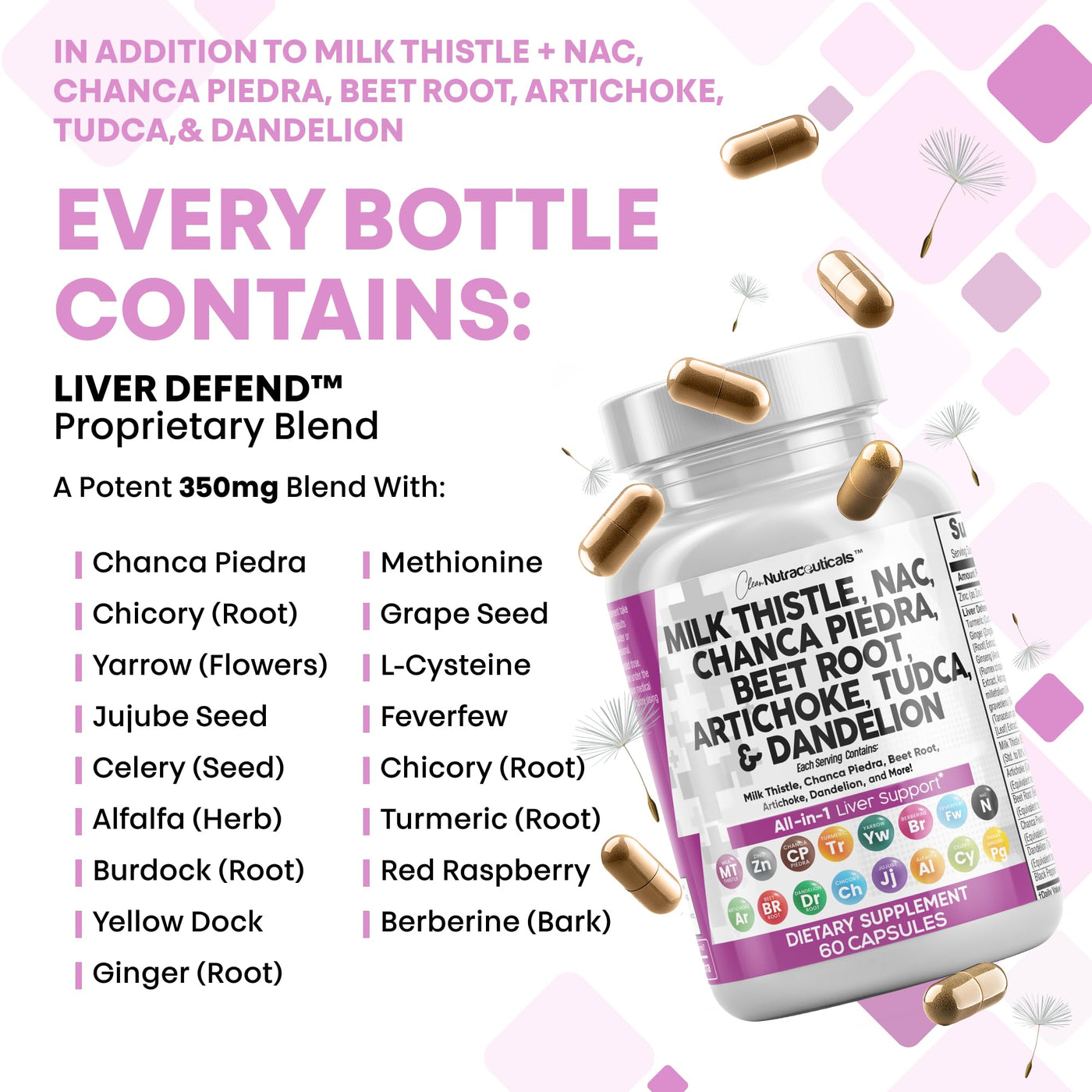 - A Powerful Liver Support Supplement - Liver Defend is overflowing with potent Milk Thistle Capsules, Dandelion Supplements, Beet Supplement, Artichoke Suppliment, Dandelion Root capsules, and nac supplement n-acetyl cysteine. Clear out the countless organic milk thistle supplements, milk thistle tincture, n-acetyl l-cysteine, beet gummies and milk thistle gummies in your cabinet and replace it with just one inclusive liver detox supplements from Clean Nutraceuticals.