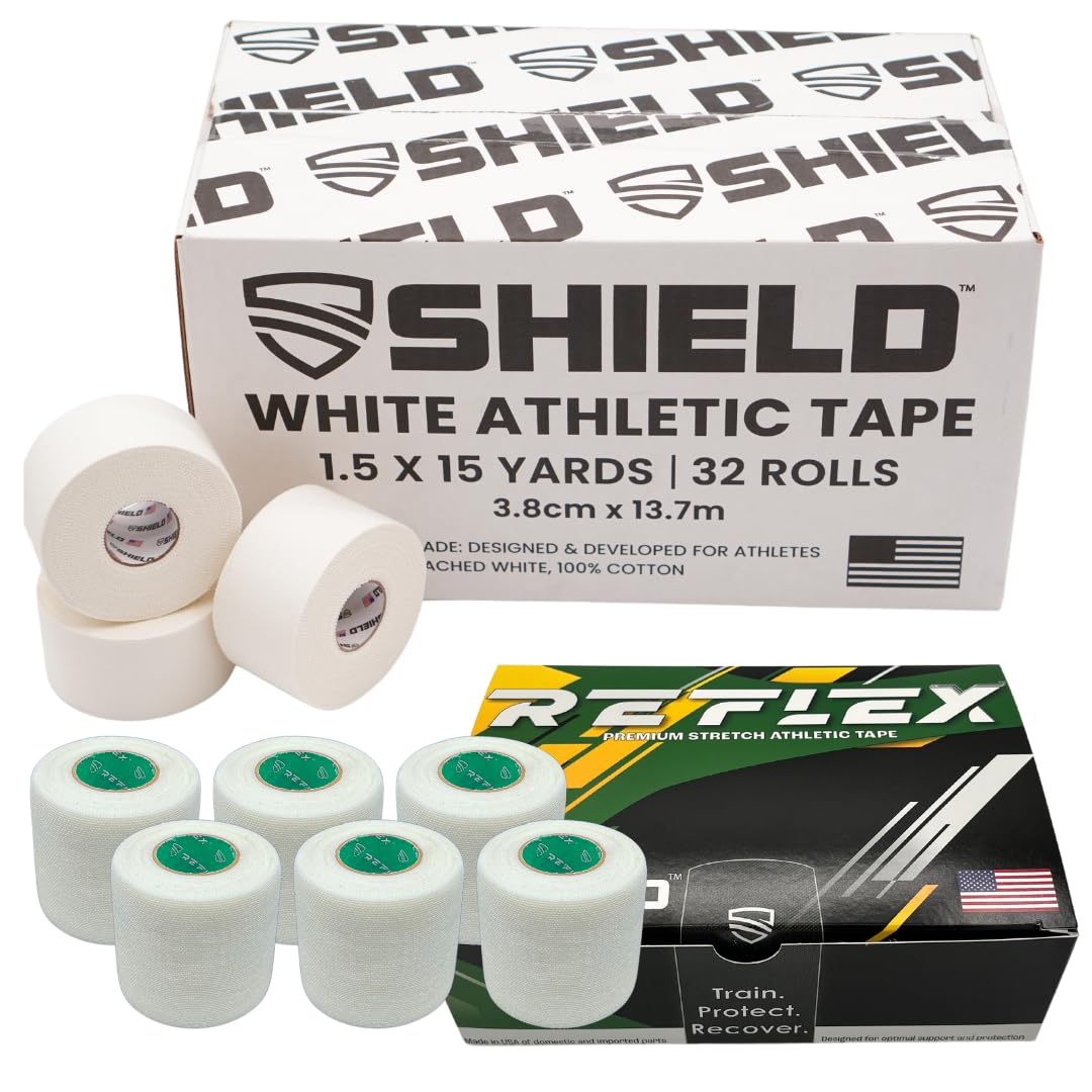 SHIELD's professional quality Athletic Tape and their professional quality Reflex Tape. Using this thin flexible but strong reflex tape to anchor our rigid tape gives you the best of both worlds. Powerful hold with the flexibility to allow a full range of movement. Both tapes offer all-day hold.