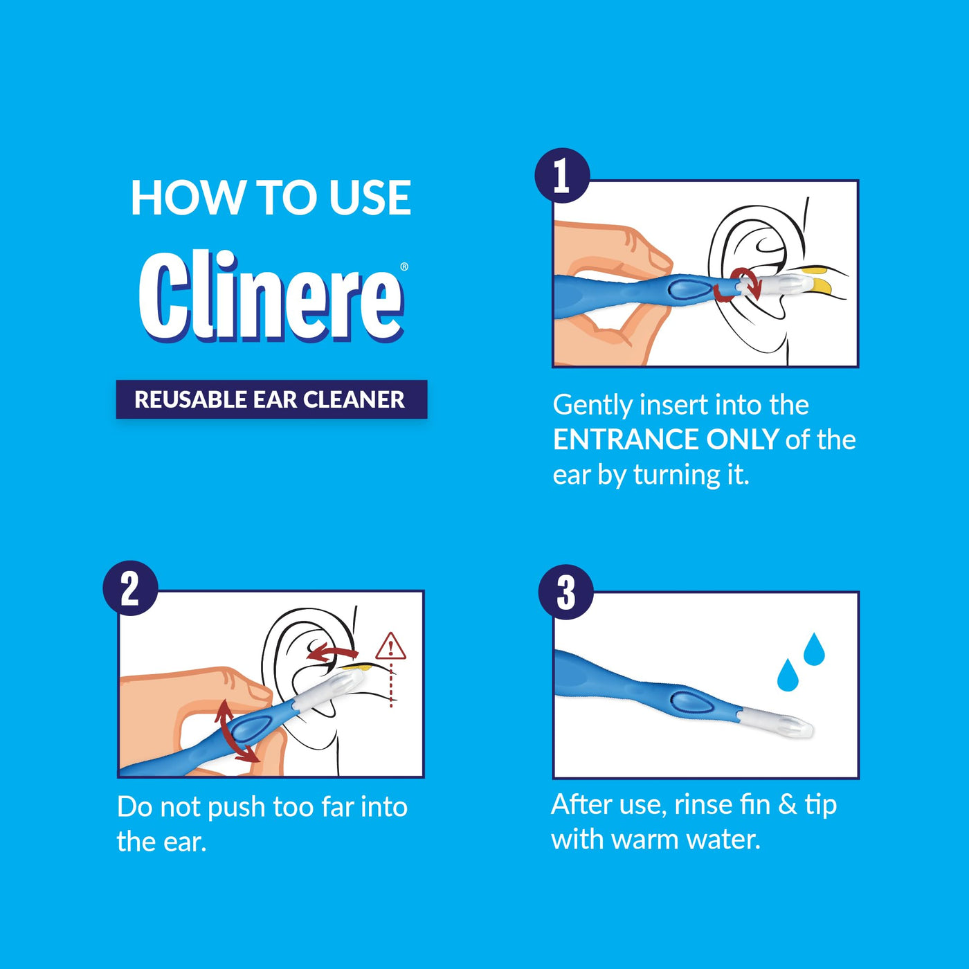 - DONT SWAB. CLINERE! The Clinere Reusable Ear Cleaner Kit offers a safer, more effective way to care for your ears. Featuring a reusable handle with a grooved, soft tip for debris removal, plus a fin for itch relief and gentle exfoliation. Ensure cleaner, happier ears with Clinere every time.