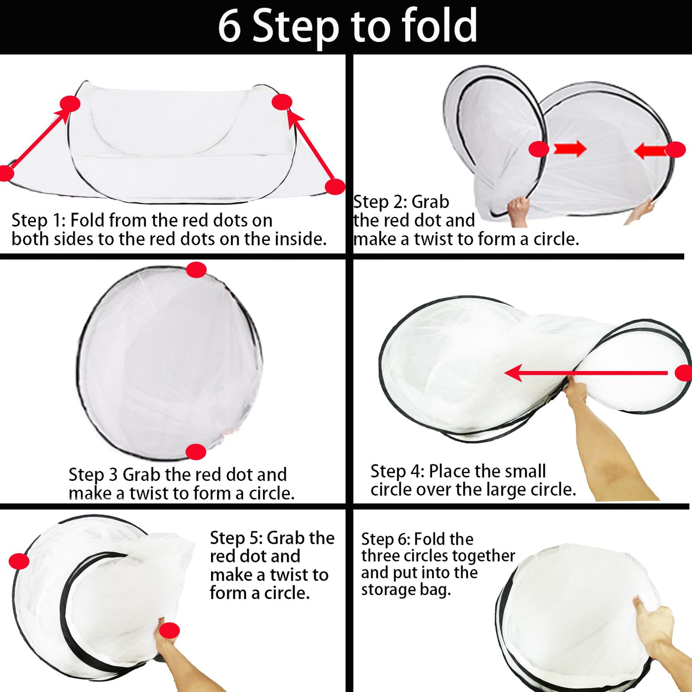 - No installation, ready to use: Pop-up mosquito nets are very easy to install because they pop into place when you take them out of the bag. Also, You just need 6 steps to fold and stored as a circle with a diameter of approximately 13.38 inch(34 cm)