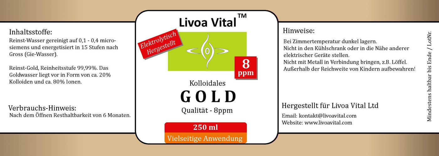 - ATTENTION IMPORTANT - A high PPM number does not equate to higher or better quality as the competition (25ppm, 50ppm, 100ppm) would have you believe. A high ppm value results in lower effectiveness. Small ppm values and therefore the smallest silver particles are desirable. The Colloidal Gold from Livoa Vital has the OPTIMUM VALUE OF 8PPM for an EXCELLENT EFFECT and is produced using a special electrolysis process.