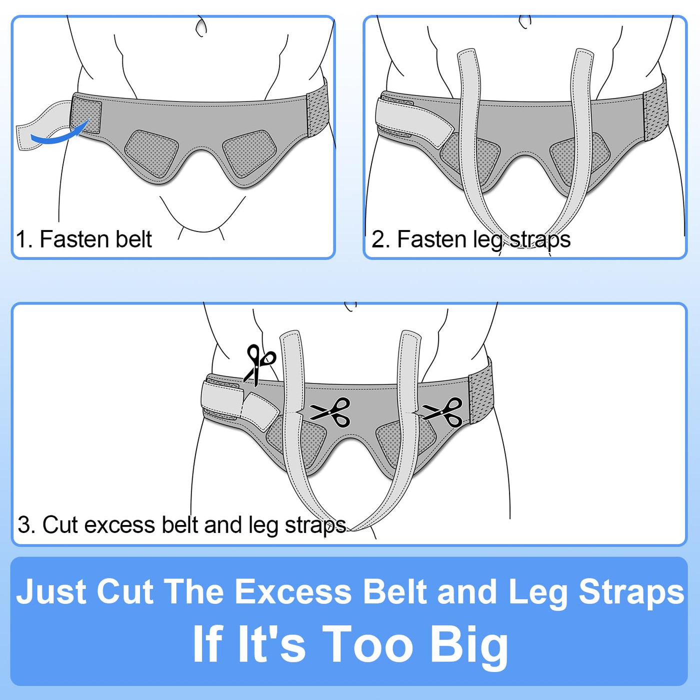 - Custom Fit: Both the waistband and groin straps are trimmable for a perfect fit, while movable groin straps ensure all-day comfort. Just adjust the waist and groin straps, cut off the extra length, and you'll end up with a custom-fit hernia truss that conforms perfectly to your body!