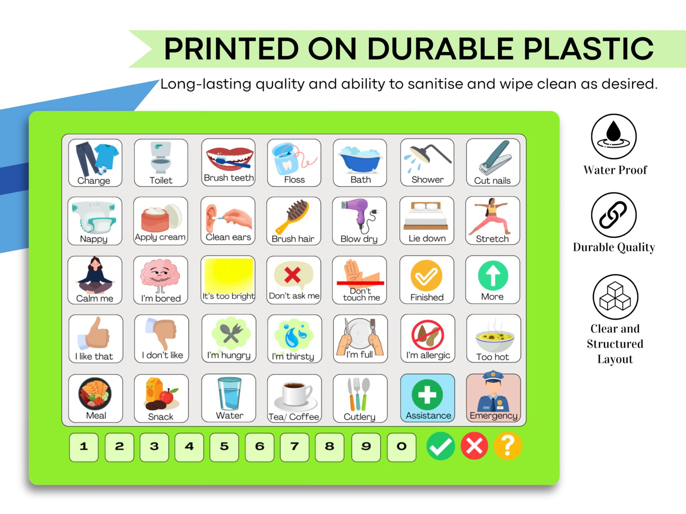 - Professional Quality: Manufactured in the UK, featuring clear medical communication symbols suitable for adult users in healthcare and family homes. With waterproof material, can be sanitised and wiped clean