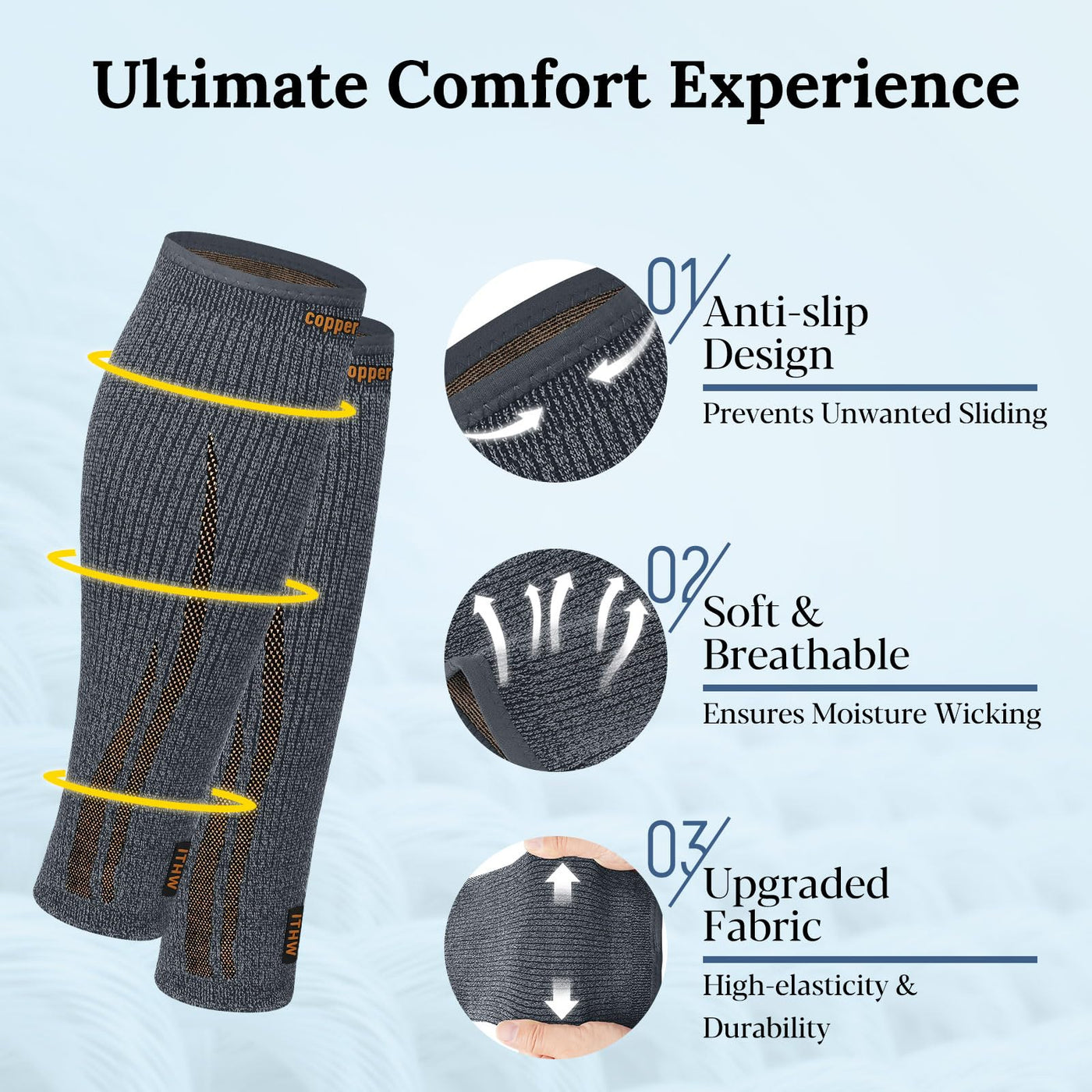 - Copper Infused Nylon: Copper-injected nylon material helps to draw electrical currents through the body's muscles and joints, reducing pain and relieving discomfort in a natural way.