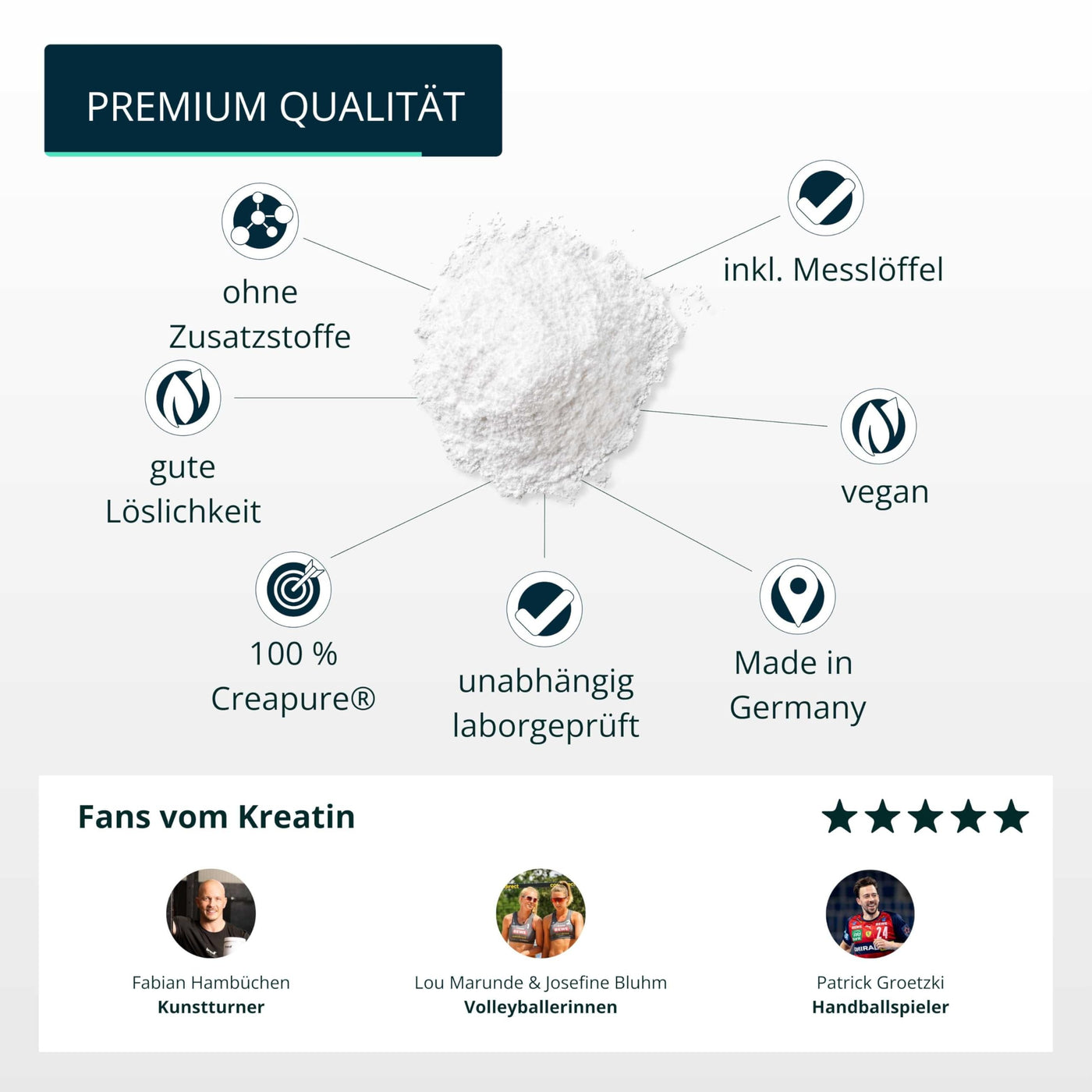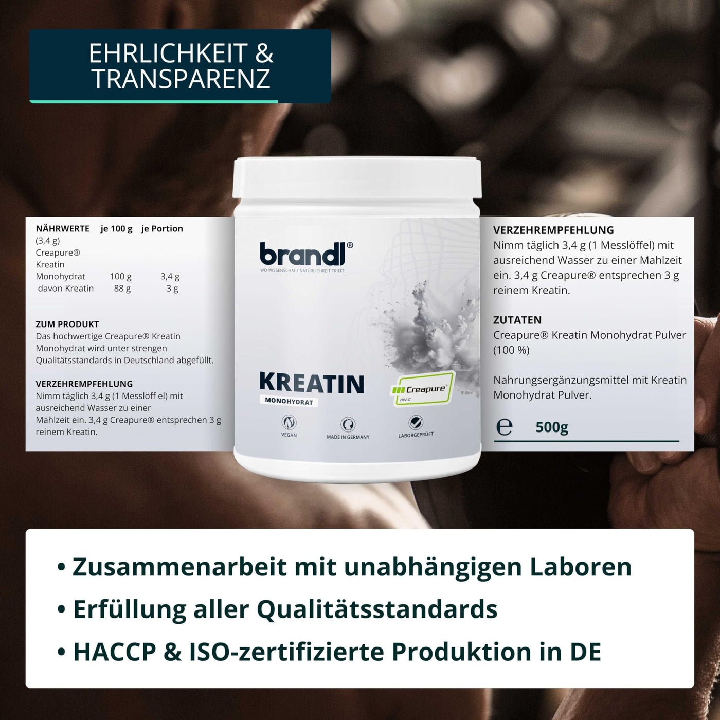 - FILLED IN GERMANY - The creatine powder is bottled in Germany in a multi-certified production facility - HACCP, ISO and GMP.