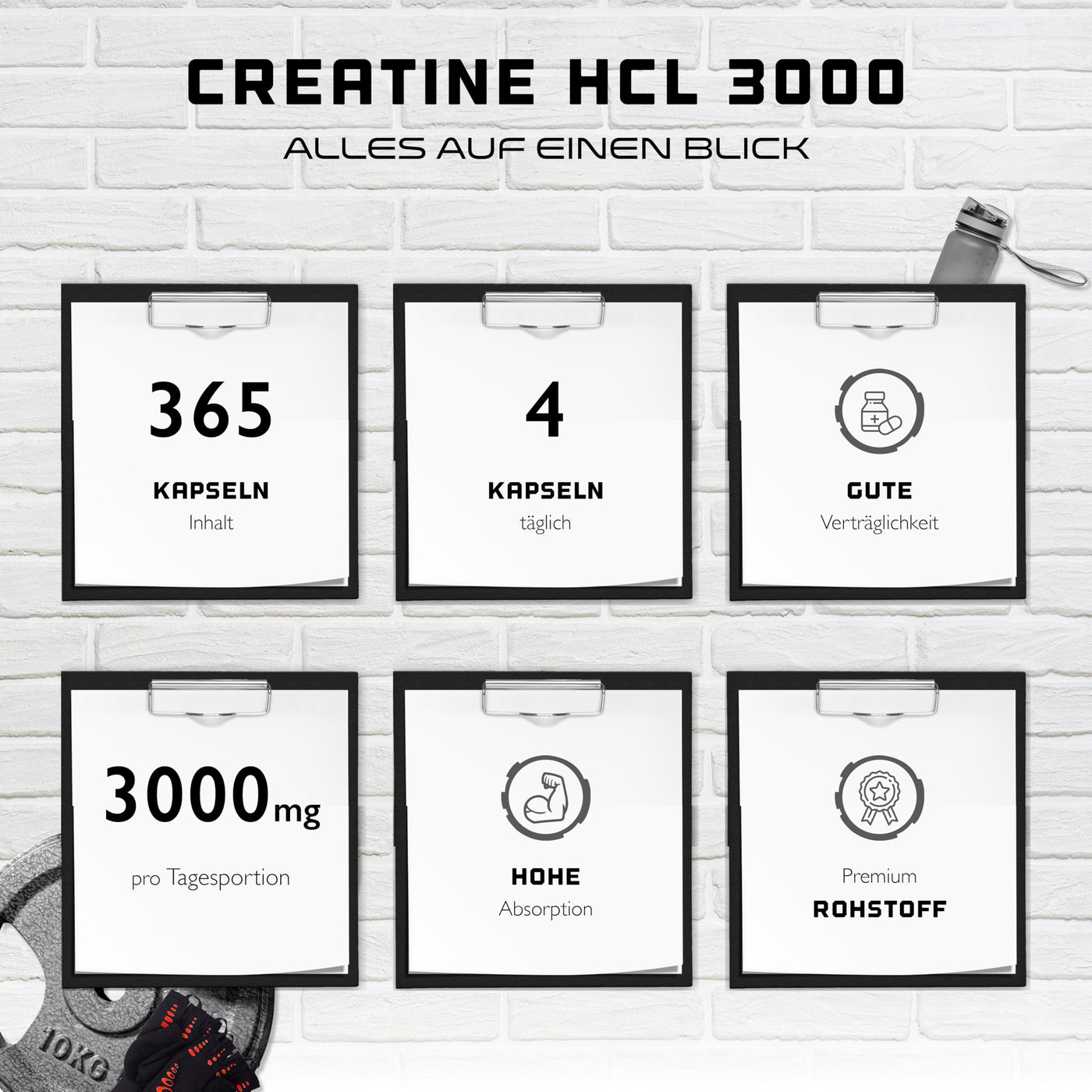 Creatine HCL - 365 vegan capsules - High dose with 3000 mg - Pure creatine hydrochloride - High absorption - High bioavailability 365 pieces