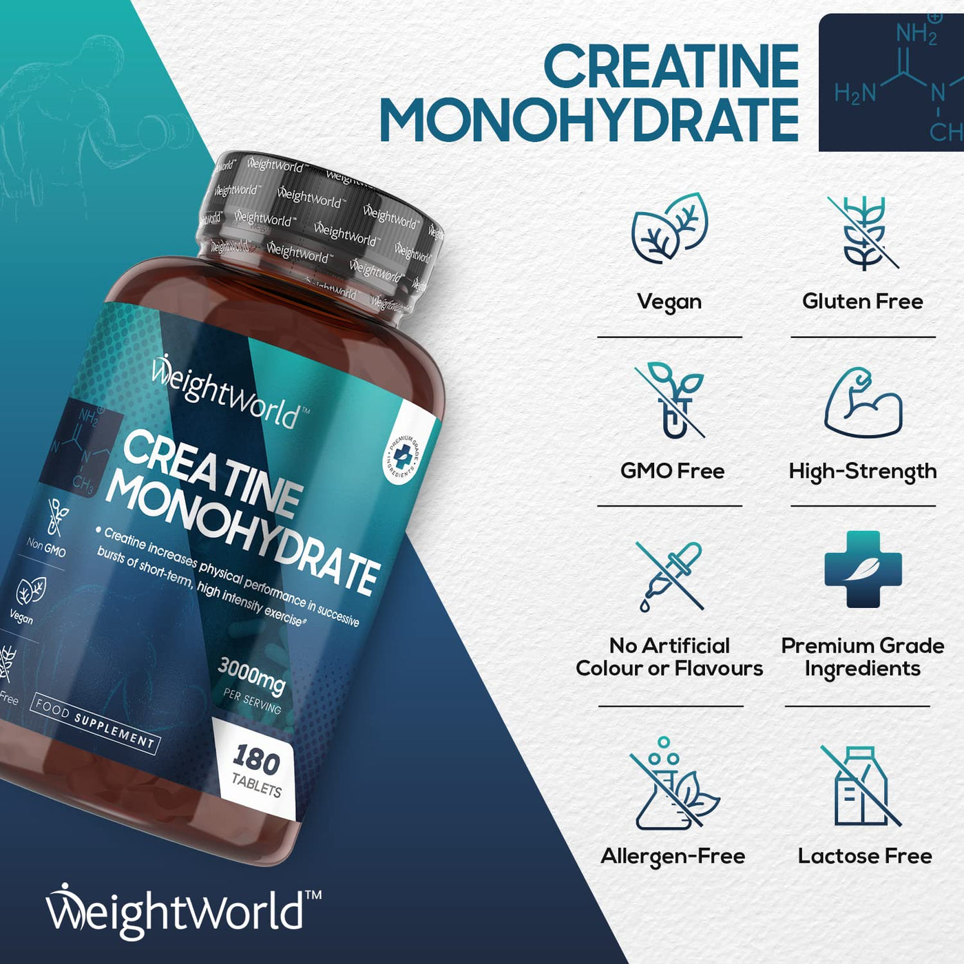 Creatine Monohydrate Tablets 3000mg - 180 Tablets - Gym Supplement for Men & Women - Creatine Monohydrate Powder Alternative - Vegan & Keto Unflavoured Energy Supplement for Workout